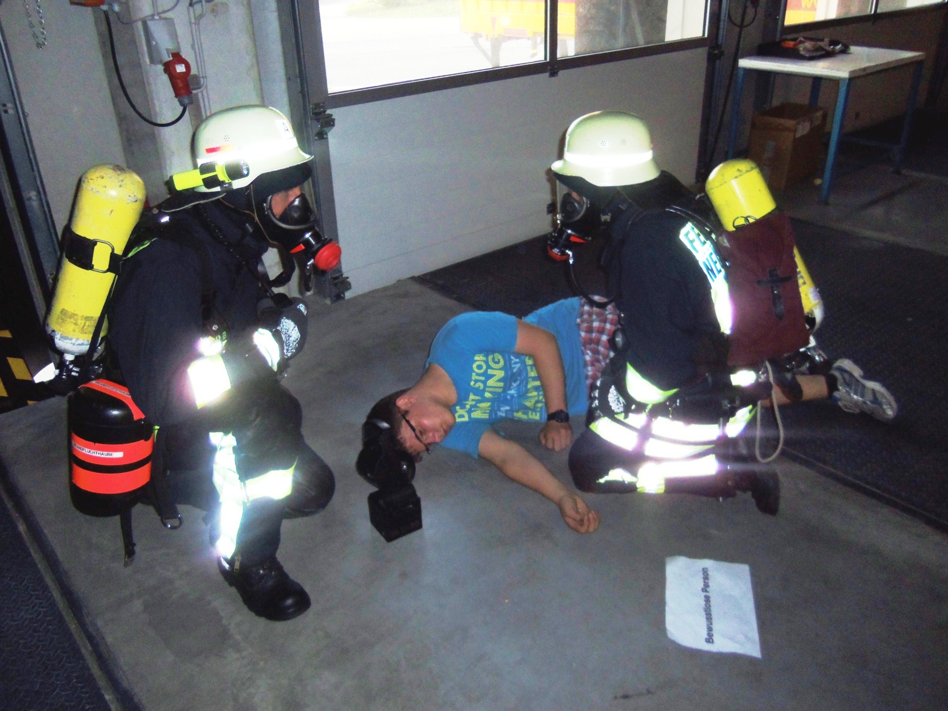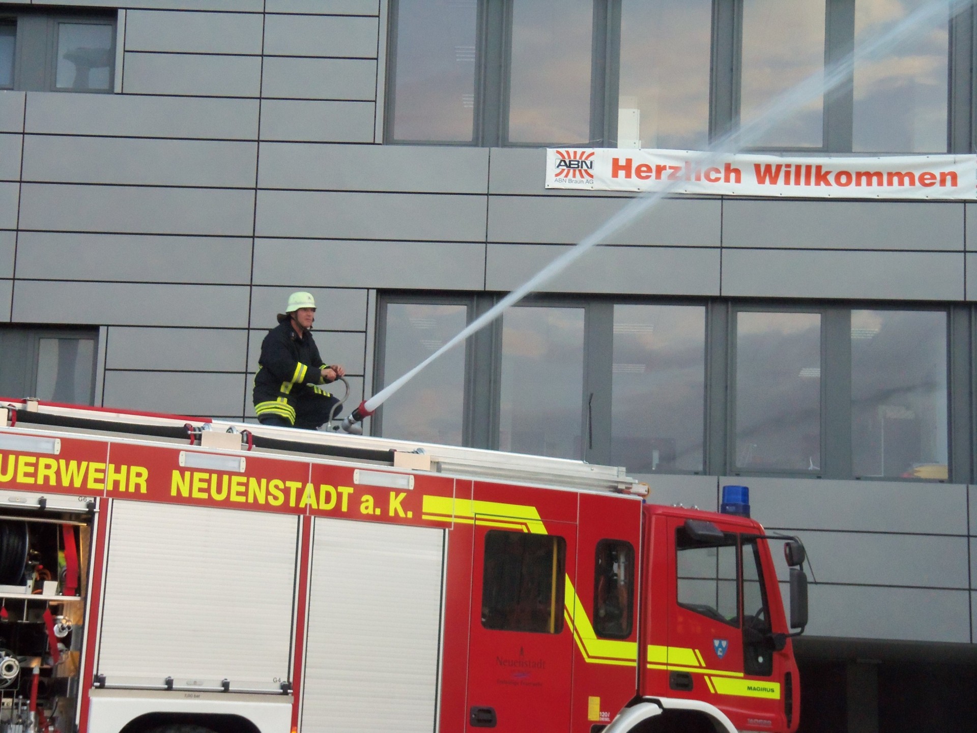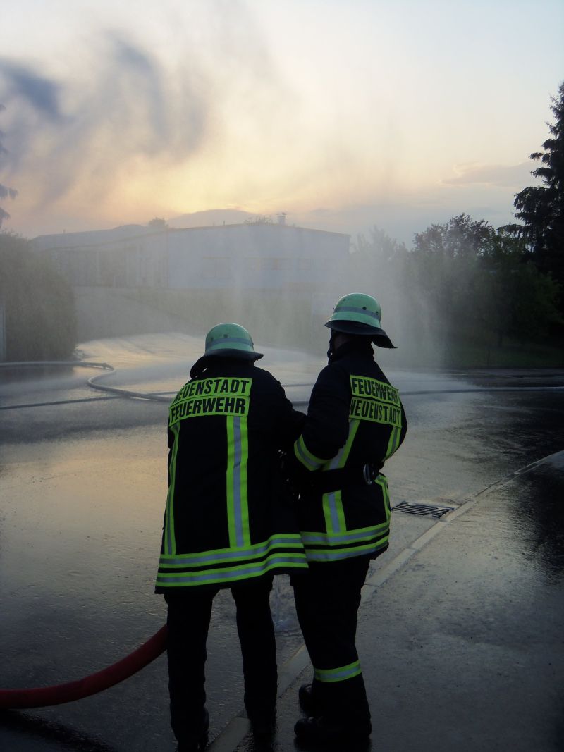 In der Nähe zur Autobahn ist in den vergangenen Jahren die Firma Albert Braun Neuenstadt weiter gewachsen. Nach der Fertigstellung des Anbaues bot sich für die Feuerwehr die Gelegenheit gemeinsam mit dem Roten Kreuz hier eine Großübung aller Abteilungen durchzuführen. Es wird ein Brandausbruch im Bereich der Verladerampe angenommen. Zwei Mitarbeiter werden bei Löschversuchen schwer verletzt, ein Lagerarbeiter ist auf einem Stapler in der Höhe eingeschlossen. Auch in den oberen Geschossen ist einigen Personen durch den tödlichen Brandrauch der Weg ins Freie versperrt. Die Feuerwehr Neuenstadt und der Rettungsdienst rücken an. Dann die Alarmmeldung „Traktorbrand in Cleversulzbach“, was zu einer Unterbrechung der Übung führte. Glücklicherweise konnte der Brand rasch unter Kontrolle gebracht werden. So konnte die Übung, leicht modifiziert eine dreiviertel Stunde später fortgesetzt werden. Die Abteilung Neuenstadt geht von der Verladerampe aus in das Gebäude vor und rettet die hier Eingeschlossenen. Stein / Kochertürn baut sich seine Wasserversorgung von der Öhringer Straße kommend auf und begibt sich zur Menschenrettung unter Atemschutz in die oberen Stockwerke des Verwaltungstraktes. Die Abteilung Cleversulzbach war unterdessen noch mit Nachlöscharbeiten des Traktorbrandes beschäftigt. Die Verletzten werden zur eingerichteten Verletztensammelstelle gebracht und vom Roten Kreuz mit versorgt. Nach Abschluss der Löscharbeiten zeigte sich Kommandant Schaffroth zufrieden mit der Leistung seiner Mannschaft. Inhaber und Enkel des Firmengründers Marcus Braun war beeindruckt von der Leistungsfähigkeit der Feuerwehr Neuenstadt. Die Feuerwehr Neuenstadt dankte der Familie Braun und ihren Mitarbeitern für die Möglichkeit an diesem Industriegebäude zu üben, nur so kann die Wehr sich auch auf zukünftige Herausforderungen einstellen und ihr Können und Wissen erweitern!