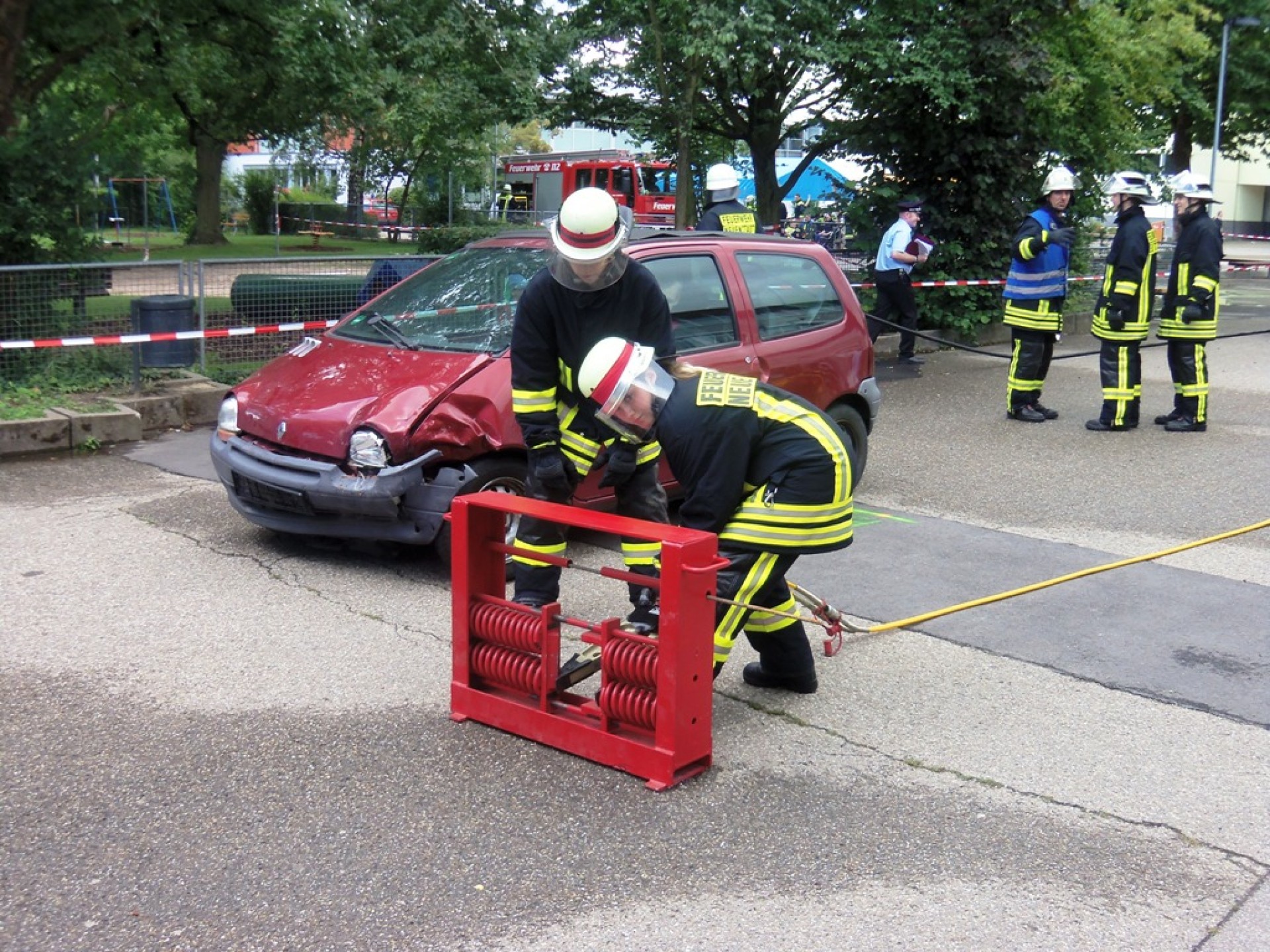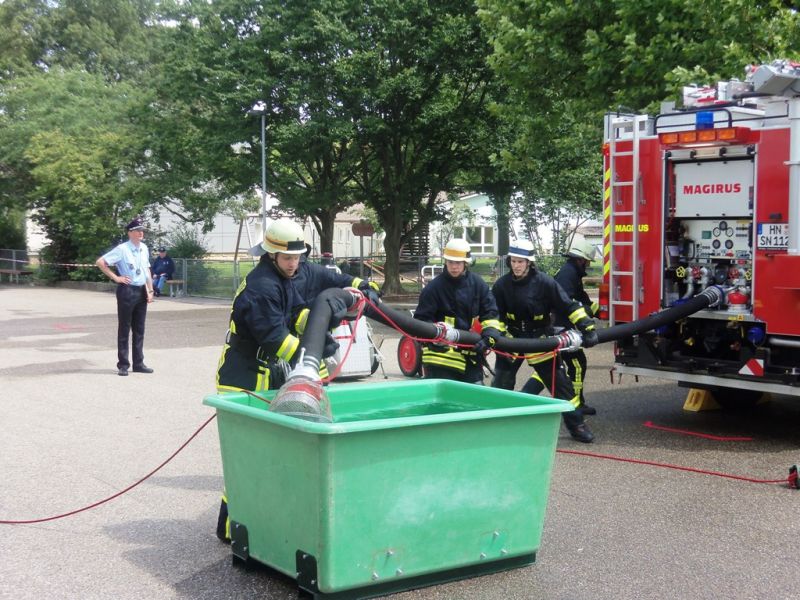 Seit einigen Monaten “probten Steffen Rückert und Tobias Schaffroth ihrer einer Gruppe verschiedene Übungsabläufe, einmal muss eine kleine Wasserkanone errichtet werden, über einen Graben muss eine Schlauchleitung mit Hilfe einer Feuerwehrleiter transportiert werden oder ein Schaumangriff wird aufgebaut. Eine dieser drei Übungen mussten die Jugendfeuerwehrleute den Schiedsrichtern vorführen. Auch das Sportliche kam hier nicht zu kurz, so musste die Mannschaft gemeinsam einen Staffellauf und Weitsprung absolvieren. Auch die Löschfahrzeuge müssen den Jugendfeuerwehrlern vertraut sein, jedes Gruppenmitglied muss die Utensilien auf dem Fahrzeug finden und erklären können.