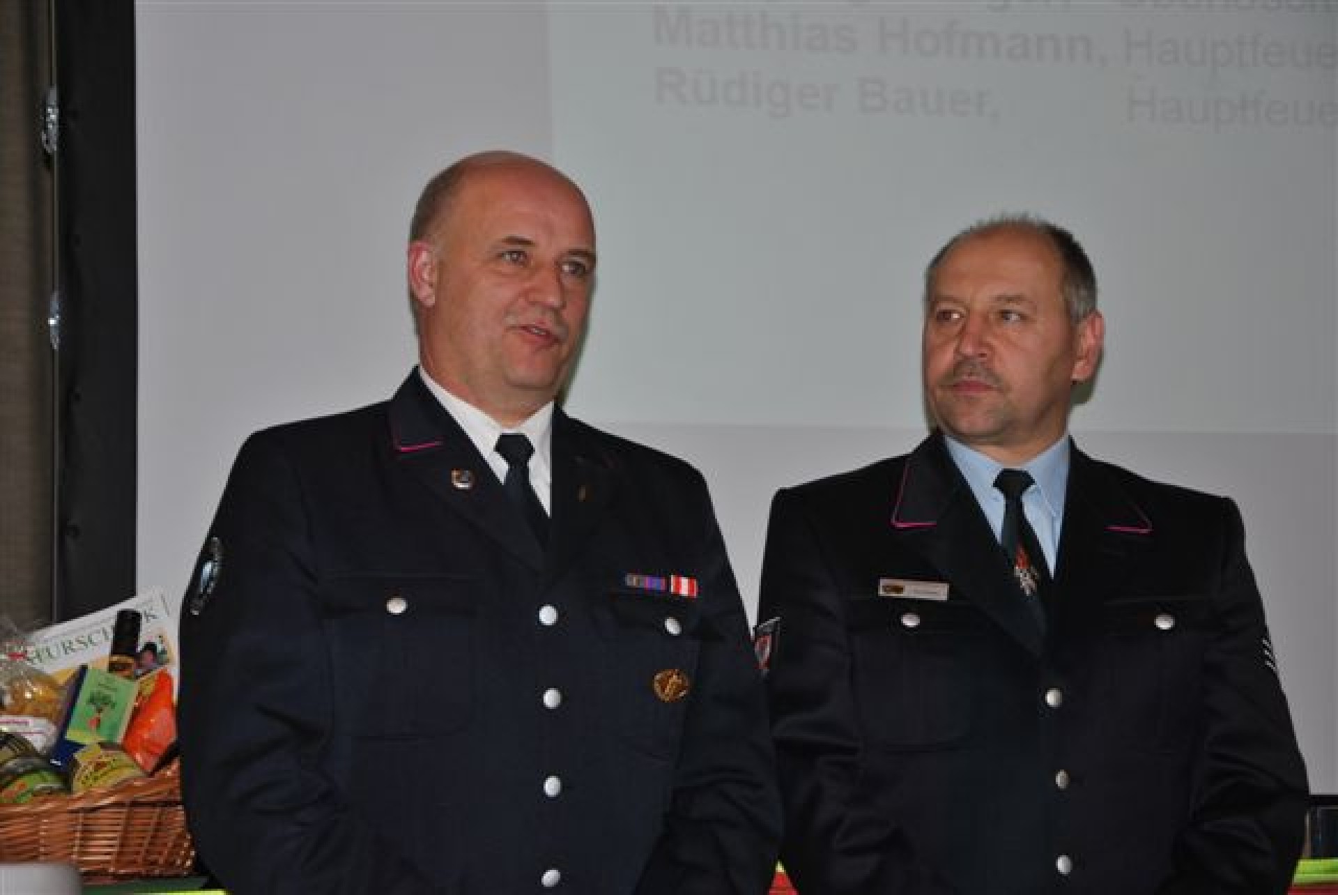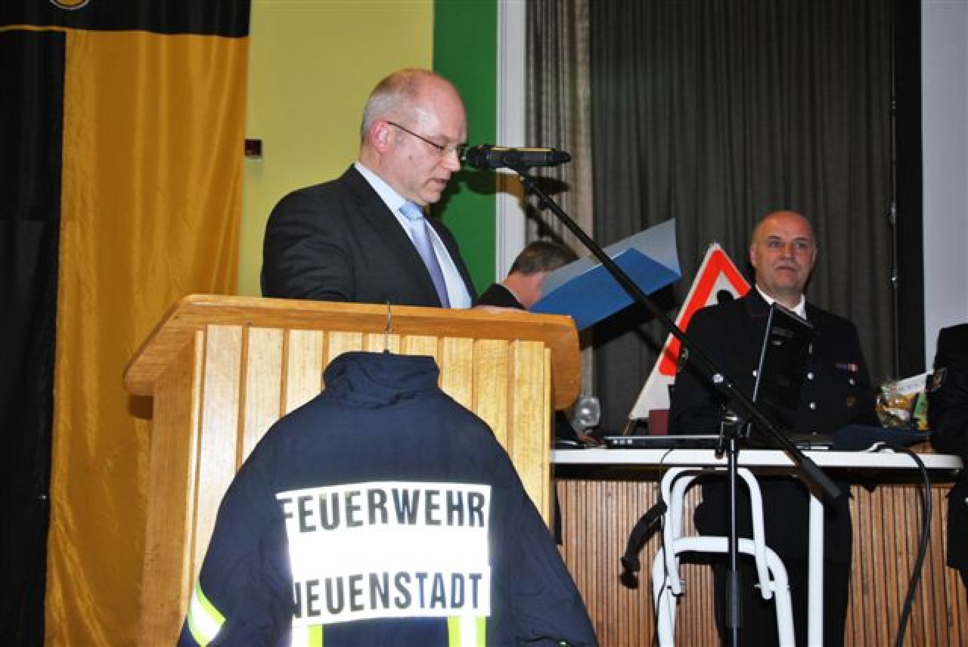 Im abgelaufenen Jahr tat sich wieder einiges bei der Feuerwehr Neuenstadt, so Kommandant Schaffroth zu Beginn seines Berichts. Die ehemalige Abteilung Kochertürn feierte ihr 125-jähriges Bestehen mit einem kleinen Festakt. Die neue Drehleiter wurde im Dezember im Beisein von Innenminister Reinhold Gall MdL an die Feuerwehr Neuenstadt übergeben. Dieses Fahrzeug verlangte den Feuerwehrmännern rund um Abteilungskommandant Roland Grünagel einiges an Übungsaufwand ab. Neben der Einweisung bei der Herstellerfirma Metz wurde im Herbst ein Drehleitermaschinistenlehrgang in Neuenstadt in Kooperation mit der Feuerwehr Weinsberg angeboten. Hier wurden 17 Kameraden der Feuerwehr Neuenstadt fit gemacht und mit dem notwendigen Rüstzeug zum Umgang mit der Drehleiter geschult. Bis ins Jahr 2012 rückte nach Neuenstadt die Drehleiter nach Neckarsulm aus, jedoch reichte hier die geforderte Eintreffzeit von 10 Minuten nicht aus. Das neue Hubrettungsfahrzeug der Abteilung Neuenstadt wird in Zukunft auch die Nachbargemeinden Langenbrettach und Hardthausen mit abdecken. Ebenfalls neu beschafft wurde ein Mannschaftstransportwagen für die Abteilung Neuenstadt, sein über 20 Jahre altes Vorgängermodell wird jedoch weiterhin benötigt, eine Jugendabteilung mit über 40 Jugendfeuerwehrmännern benötigt auch geeignete Transportmöglichkeiten.