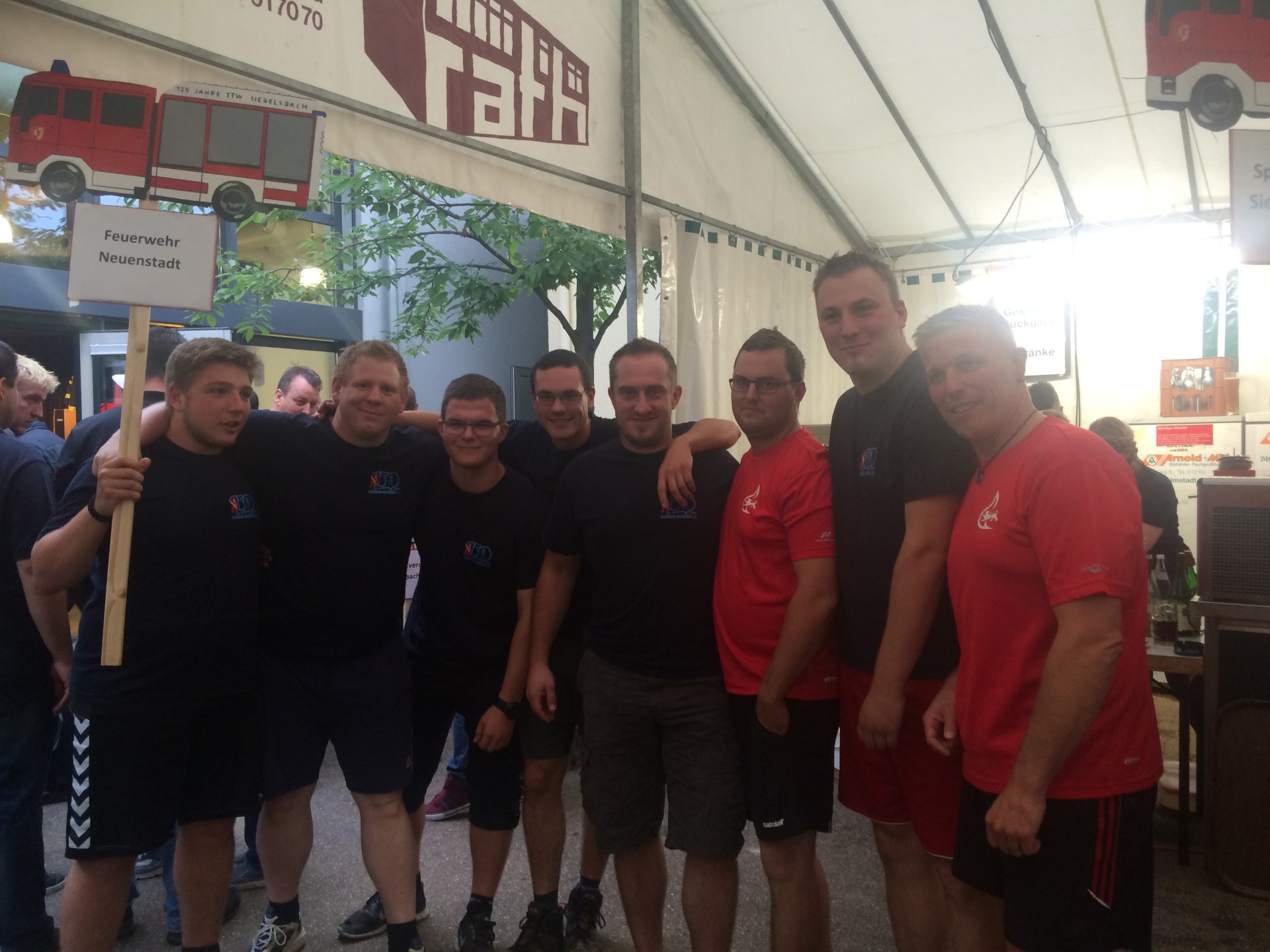In der 2. Disziplin ging es darum, dass 3 Männer in jeweils 1 Strahlrohr pusten mussten, um einen Luftballon platzen zu lassen. Die 3 Strahlrohre waren mit einem Verteiler verbunden. Der 4. Mann, der somit übrig war, war zuständig für Motivation und Festhalten des Luftballons, was bei Neuenstadt 1 sehr erfolgreich verlief. Neuenstadt 2 hingegen war hier leider nicht so erfolgreich. Im 3. Spiel wurden nur 2 Spieler aus den 4er Teams benötigt. Hier ging es darum, einen Bier Krug möglichst lange zu stemmen. Der erste musste mit links stemmen, der 2. mit rechts. Hier war Neuenstadt 1 leider nicht sehr erfolgreich und musste schon als 2. absetzen, was den vorletzten Platz bedeutete. Neuenstadt 2 machte es hier besser und wurde in dem Spiel Achter.