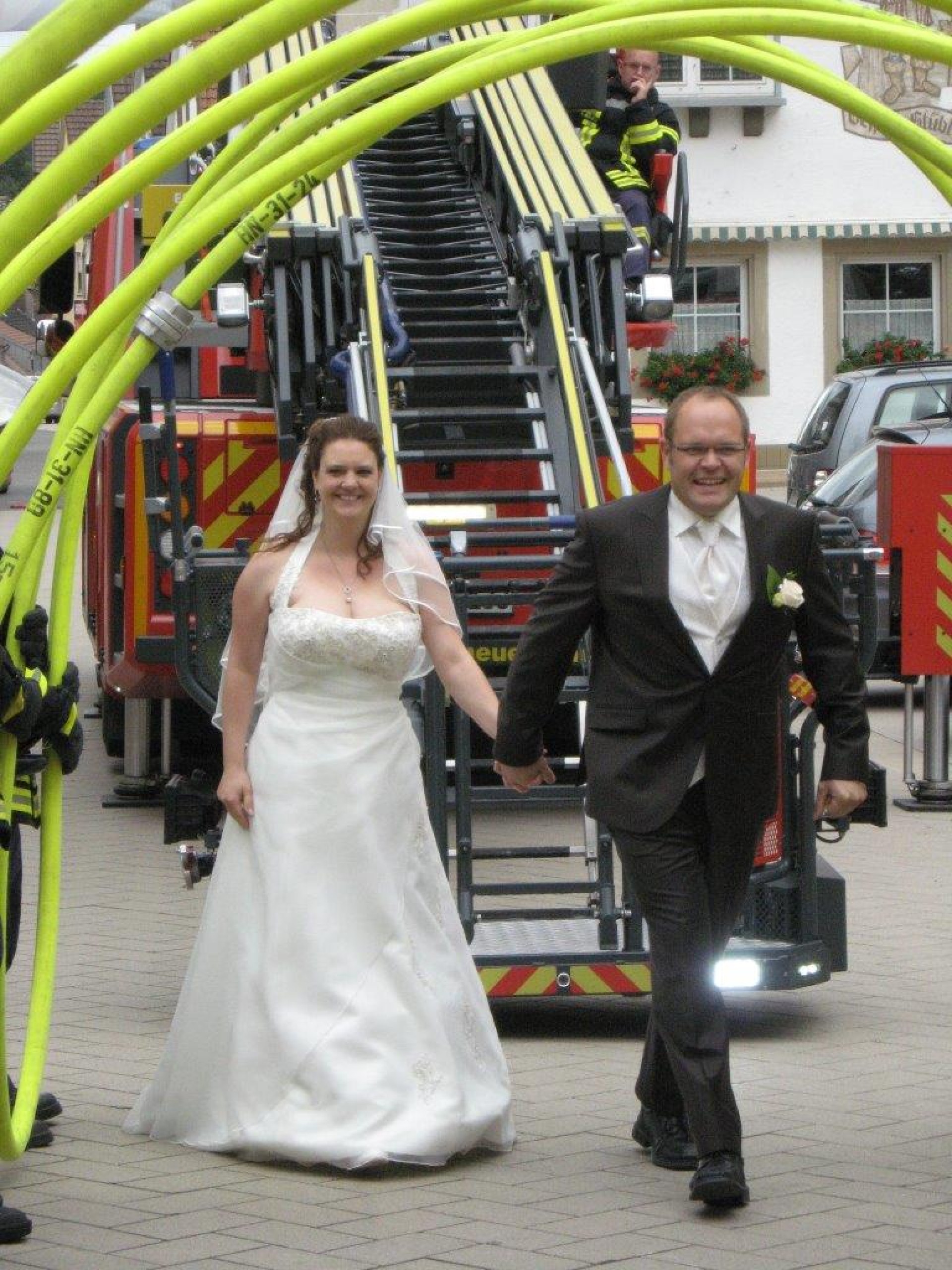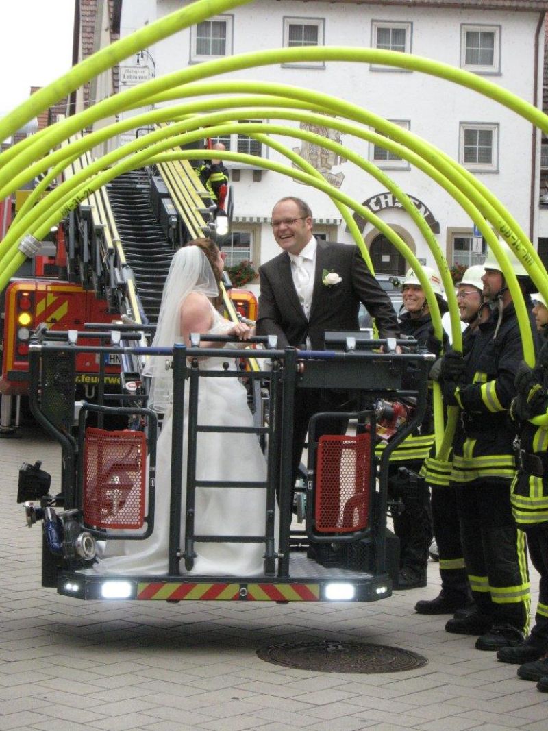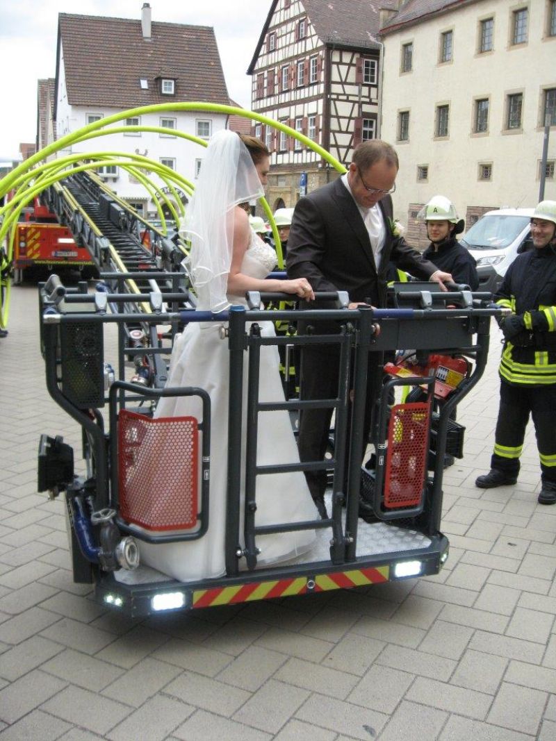 Uwe musste den Korb der Drehleiter durch einen Schlauchbogen manövrieren um dann mit seiner Frau im 7.Himmel über Neuenstadt schweben zu können.