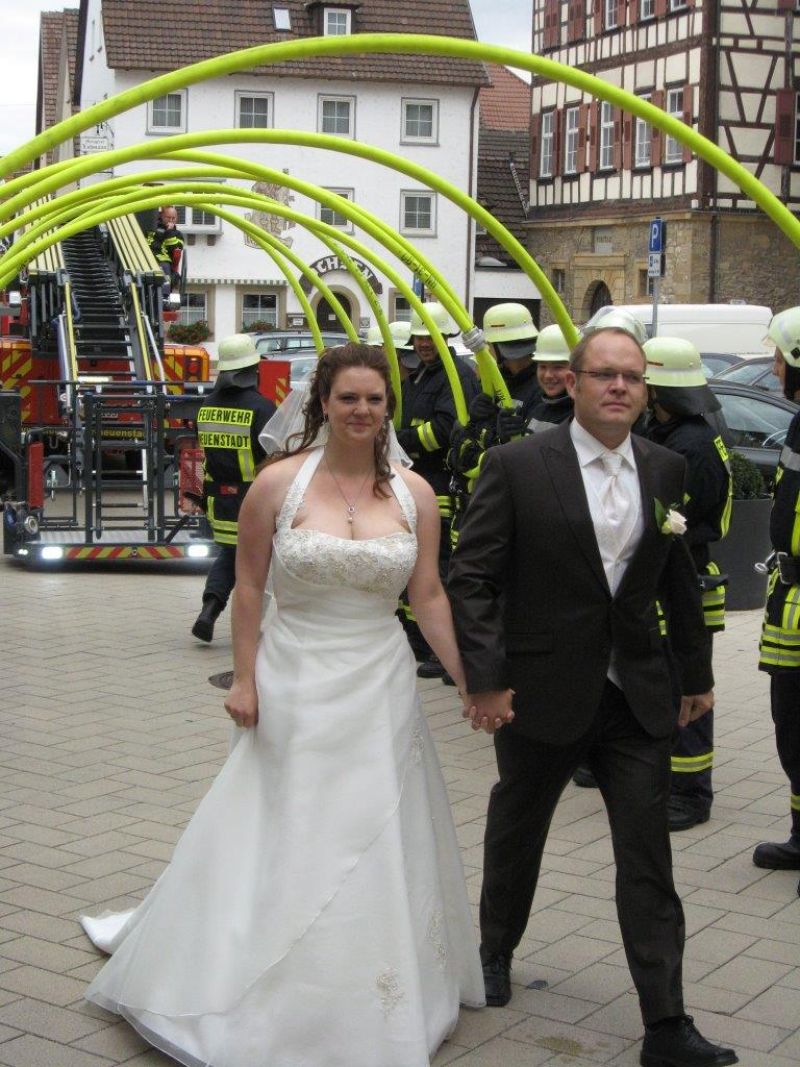 Zur kirchlichen Vermählung des Neuenstadter Feuerwehrmanns und Gruppenführer Uwe Murawski mit seiner Frau Kristin, standen viele Kameraden aus Neuenstadt und Cleversulzbach Spalier.