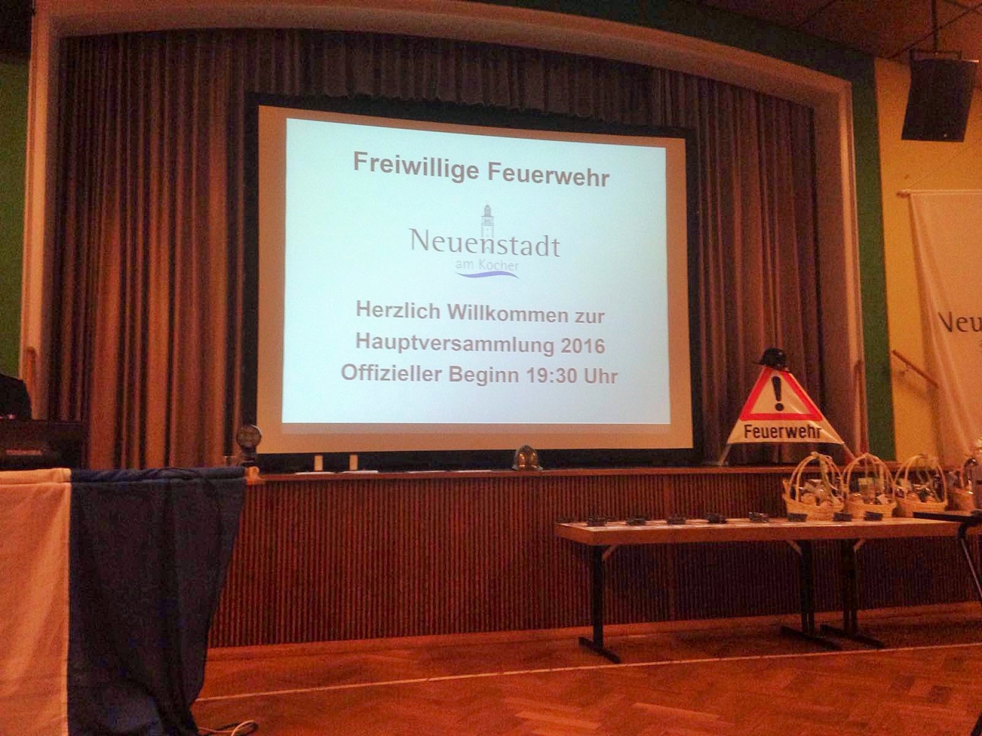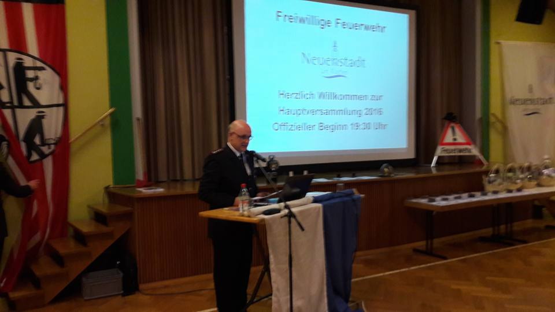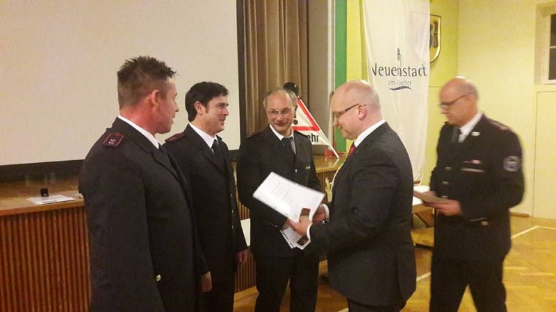 Bürgermeister Heuser würdige die Arbeit der Feuerwehr und sprach den Dank im Namen der Stadt und des Gemeinderates aus. Die Feuerwehr hat zum Schutz der Bürger einen hohen Stellwert in der Stadt, auf sie ist Verlass, so Heuser. Kommandant Eberhard Jochim als stellv. Vorsitzender des Kreisfeuerwehrverbands, zeigte sich erfreut über die Untersützung der Stadt bei der Beschaffung des neuen Hilfeleistungslöschfahrzeuges 20 welches vor kurzem bestellt wurde. Kommandant Hartmut Schaffroth wurde anschließend für seine Verdienste und Mitarbeit in Gremien der Feuerwehr im Landkreis geehrt. Unter anderem ist er Mitglied des Führungstabes des Landkreises sowie im Kreisfeuerwehrausschuss. 14 Jahre lang leitete er die Jugendfeuerwehrarbeit in Neuenstadt, bevor er 2002 stellvertretender und ab 2007 Jahren Kommandant der Feuerwehr wurde.
