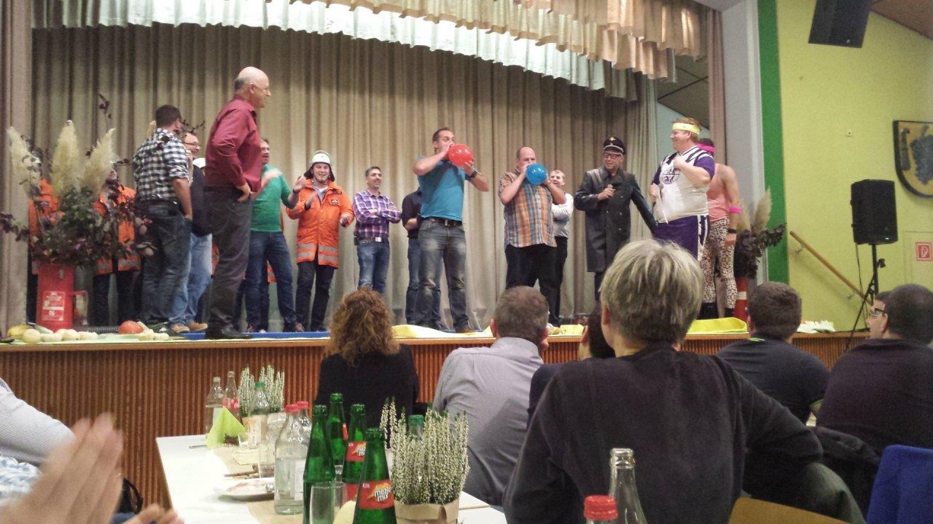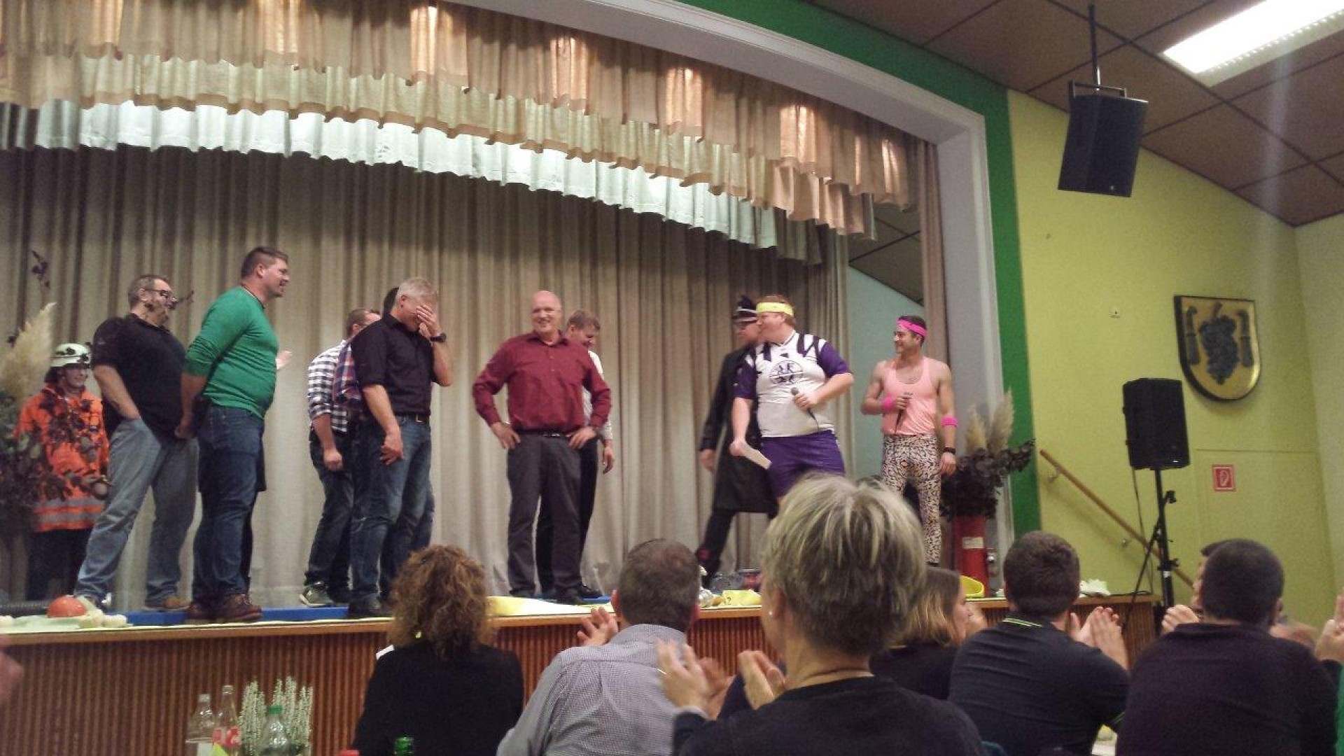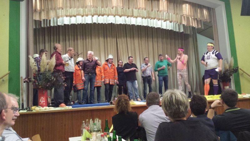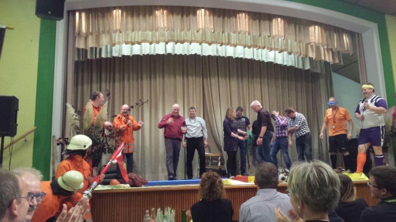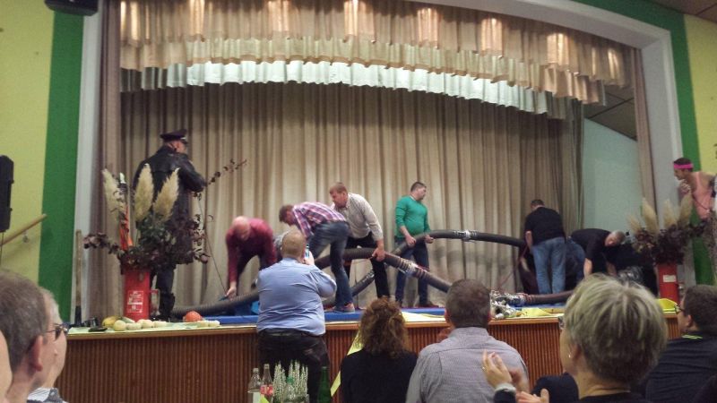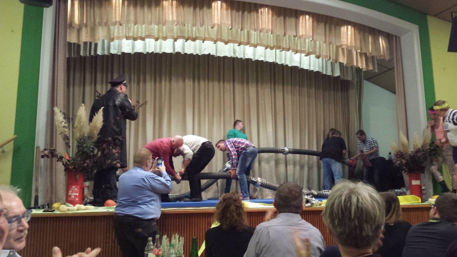 In diesem Jahr wurde wieder ein bunter Abend mit einem abwechslungsreichen Programm den fast 200 Besuchern geboten. So mussten sich Kommandant Hartmut Schaffroth gemeinsam mit den Abteilungskommandanten Andreas Küstner, Jürgen Heiß und Matthias Belz in einem Wettkampf vier Mitgliedern aus der Mannschaft stellen. Hier wurde unter anderem Wettkuppeln von Saugschläuchen und das stopfen eines Leinenbeutels als Disziplinen abgeprüft. Der Schiedsrichter des Wettbewerbs und Abteilungskommandant i.R. Roland Grünagel stellte hinterher ein gerechtes Unentschieden fest.