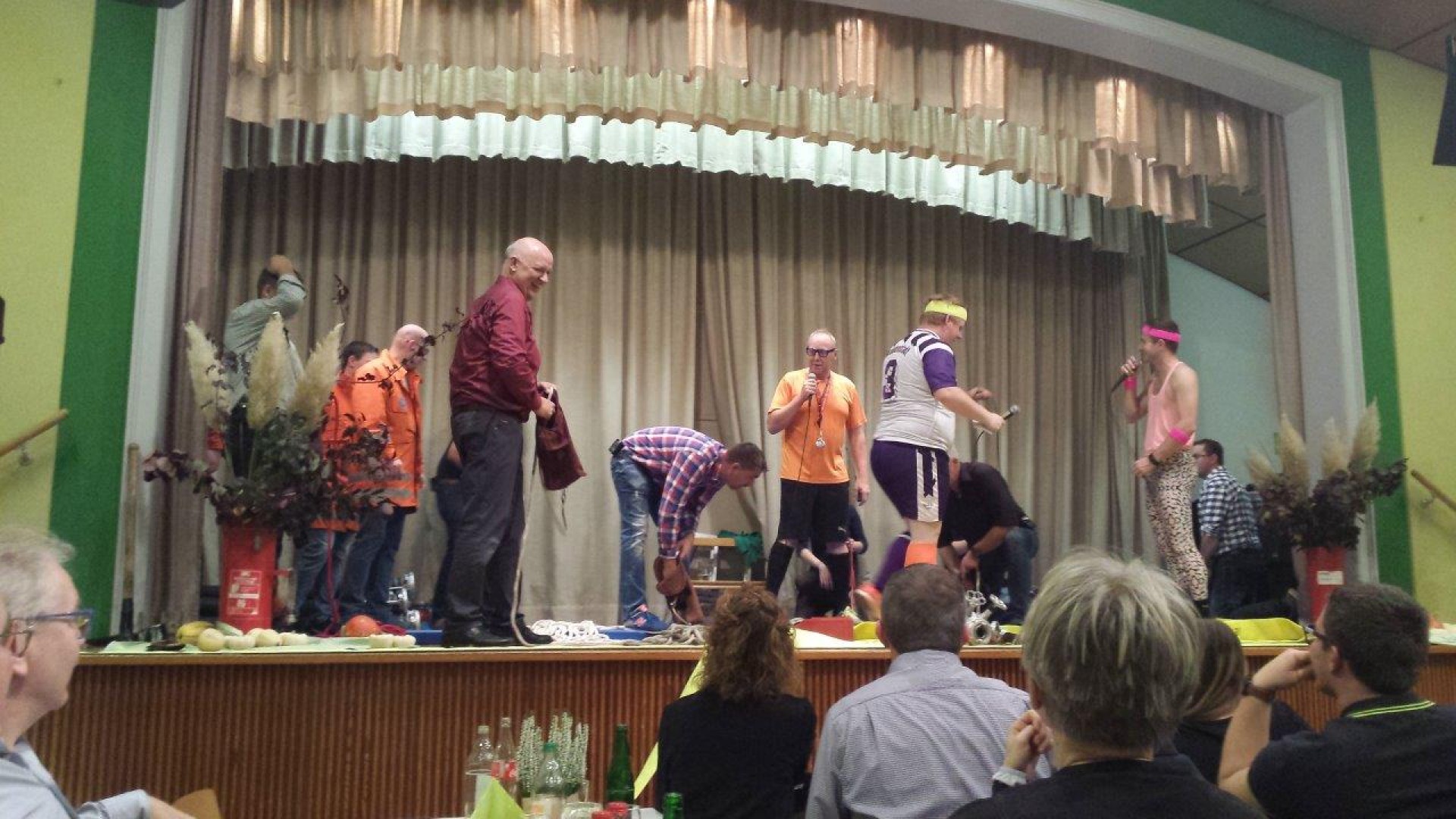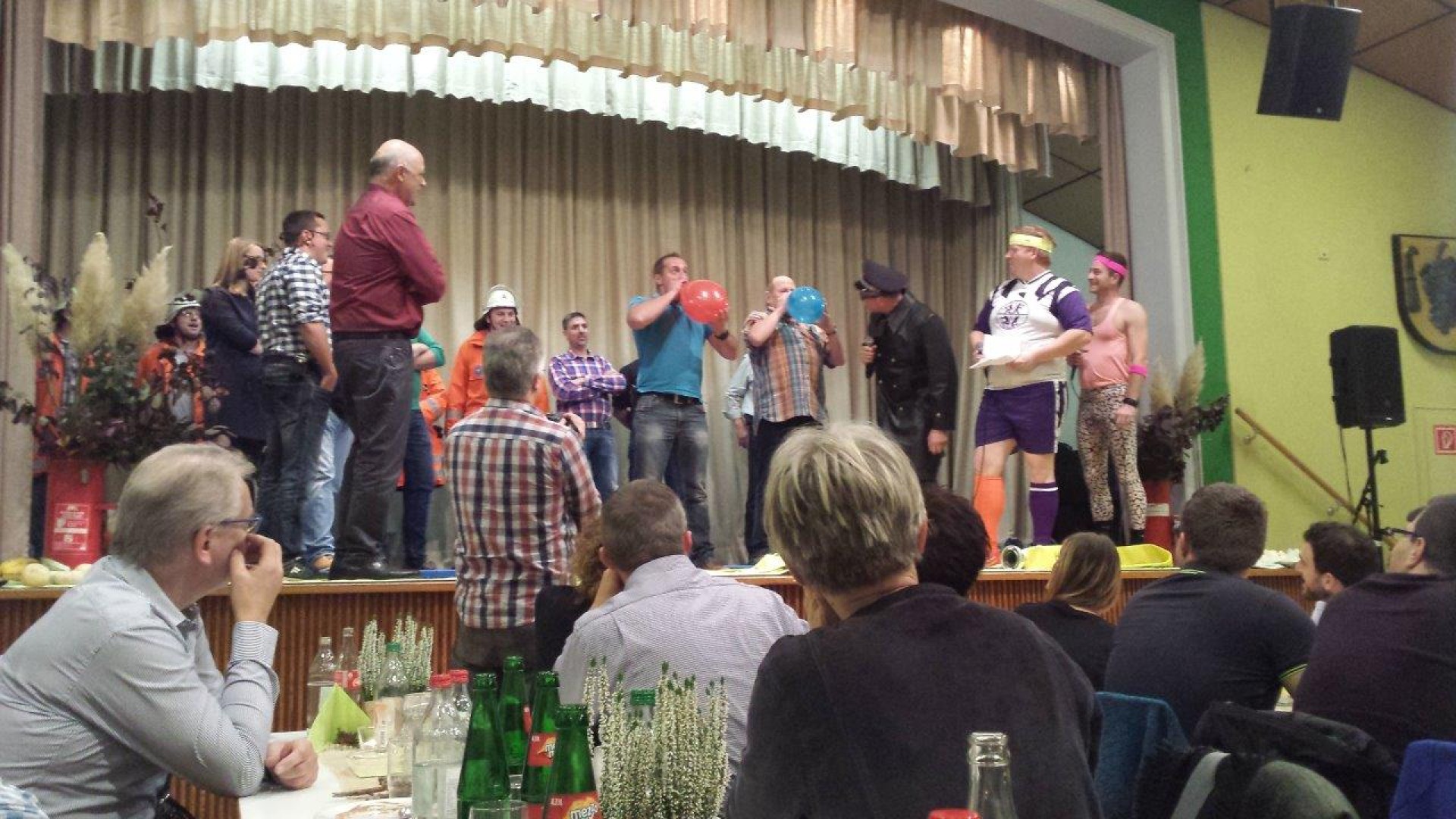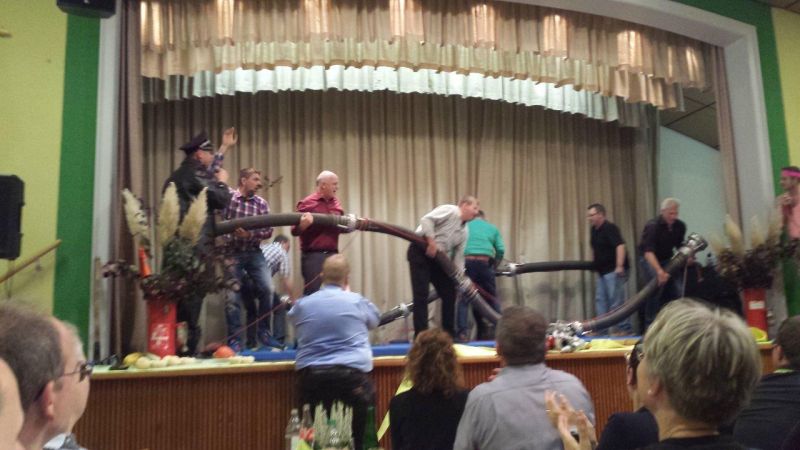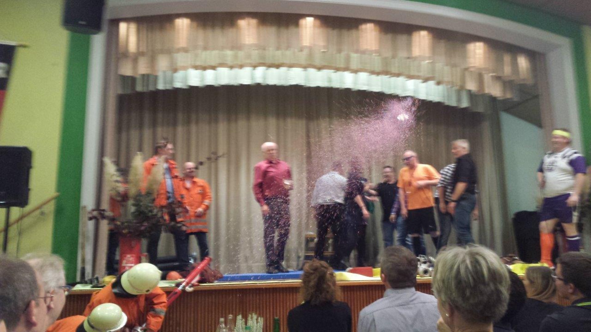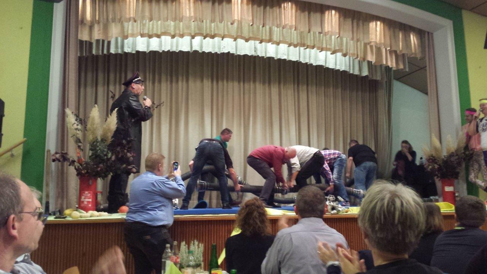 In diesem Jahr wurde wieder ein bunter Abend mit einem abwechslungsreichen Programm den fast 200 Besuchern geboten. So mussten sich Kommandant Hartmut Schaffroth gemeinsam mit den Abteilungskommandanten Andreas Küstner, Jürgen Heiß und Matthias Belz in einem Wettkampf vier Mitgliedern aus der Mannschaft stellen. Hier wurde unter anderem Wettkuppeln von Saugschläuchen und das stopfen eines Leinenbeutels als Disziplinen abgeprüft. Der Schiedsrichter des Wettbewerbs und Abteilungskommandant i.R. Roland Grünagel stellte hinterher ein gerechtes Unentschieden fest.