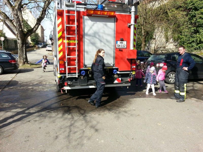 Die Feuerwehr Neuenstadt Abteilung Neuenstadt war zum Besuch bei Kindern und Erzieherinnen in der Kita im Mühlweg.