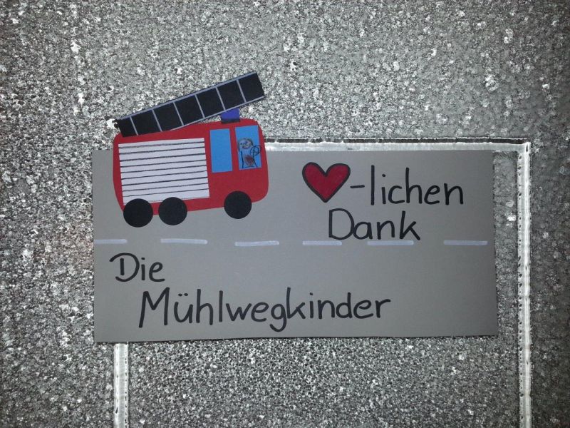 Die Kinder erwarteten zwei Feuerwehrmänner und eine Feuerwehrfrau freudig im Stuhlkreis sitzend und sangen das Lied von der Feuerwehr, welches uns sehr beeindruckt hat. Wir bekamen auch noch ein liebevoll gemaltes Willkommenschild überreicht.