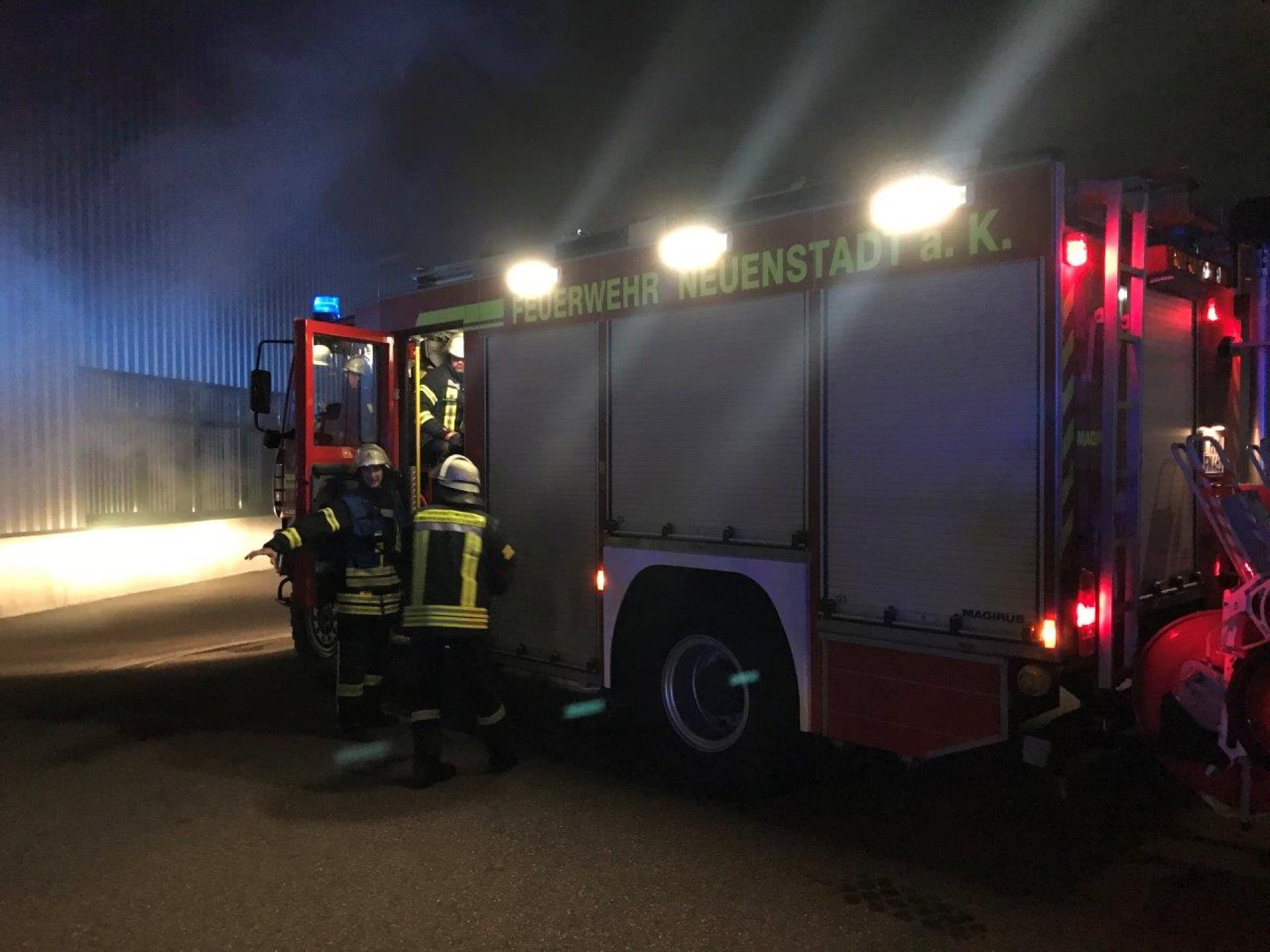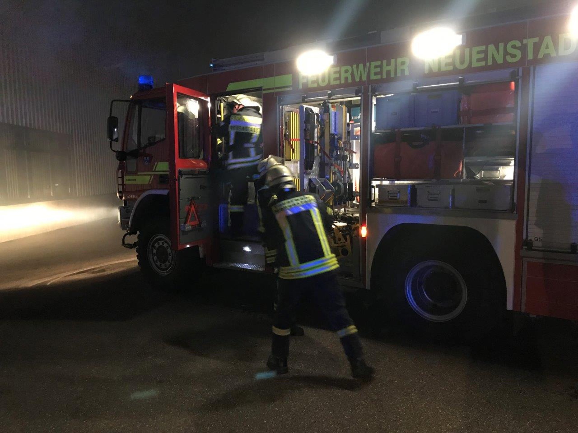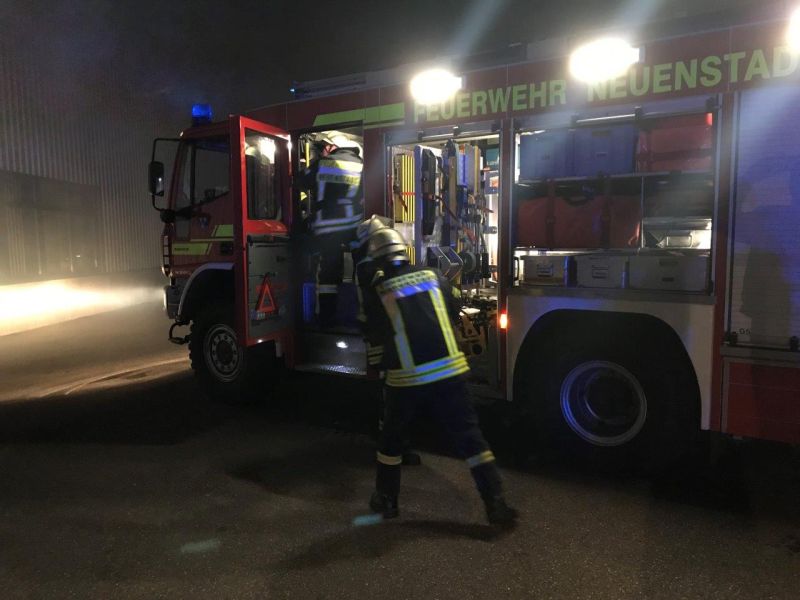 Die Abteilung Neuenstadt wird durch die installierte Brandmeldeanlage automatisch alarmiert. Nach Eintreffen der Feuerwehr stellt Einsatzleiter Tobias Schaffroth fest, dass der Löschzug aus Neuenstadt, bestehend aus Kommandowagen, zwei Hilfeleistungslöschfahrzeugen und der Drehleiter, nicht ausreichend ist. Daraufhin werden die Abteilungen Cleversulzbach und Stein/Kochertürn sowie der Löschzug aus Neckarsulm nachalarmiert. Die Führungsgruppe wird eingerichtet und es werden zwei Einsatzabschnitte gebildet. Den ersten Abschnitt übernimmt die Abteilung Neuenstadt unter Zugführer Jochen Schuster. Als erste Maßnahmen wird der eingeklemmte Fahrer im PKW befreit und die Erstversorgung übernommen, durch die Drehleiter wird eine Riegelstellung zwischen Fabrikhalle und Verwaltungsgebäude von Mlog Logistics aufgebaut. Über die Führungsgruppe wird die Gefahr des auslaufenden Stoffs festgestellt und es können die notwendigen Maßnahmen getroffen werden. Der zweite Abschnitt wird unter Zugführer Andreas Küstner durch die beiden Löschfahrzeuge aus Stein sowie das Tragkraftspritzenfahrzeug aus Cleversulzbach gebildet. Der Schwerpunkt ist hier Menschenrettung im Gebäude unter Atemschutz. Nach einem umfassenden Einsatz, im verstärkten Trupp, können die beiden verunfallten Personen sowie weitere im Gebäude vom Rauch eingeschlossene Mitarbeiter gerettet und dem Rettungsdienst übergeben werden. Im Anschluss daran wurden die Palettenstapel gelöscht und das Feuer unter Kontrolle gebracht.