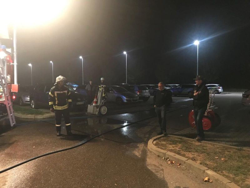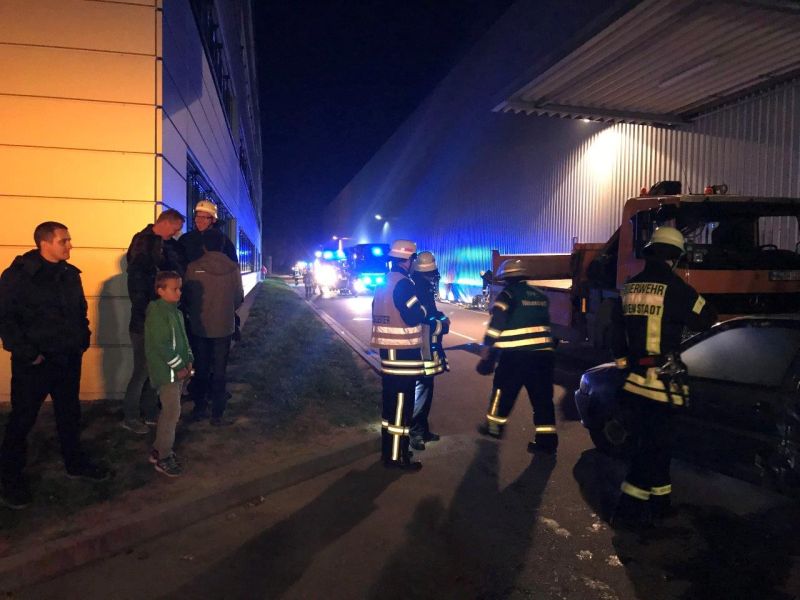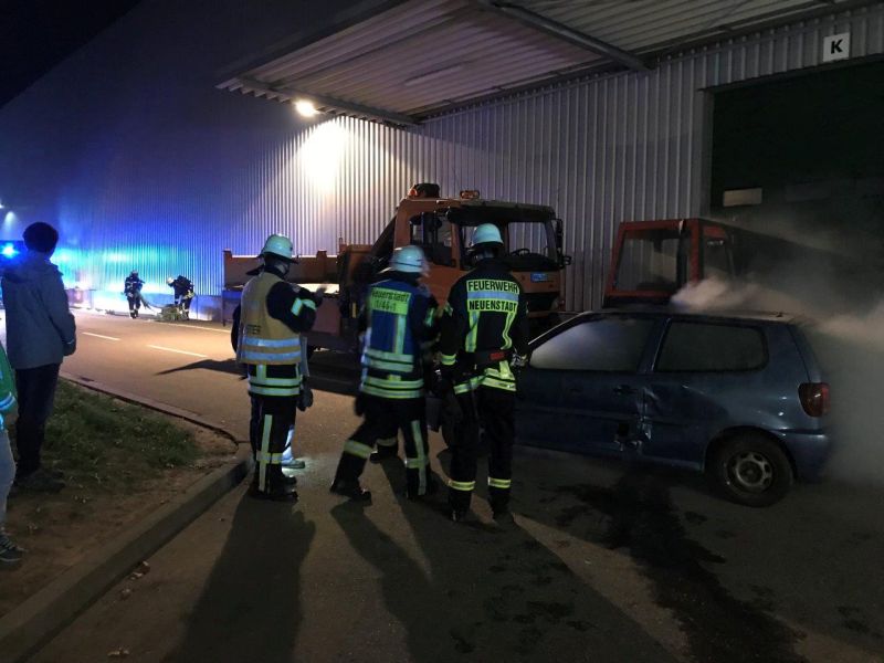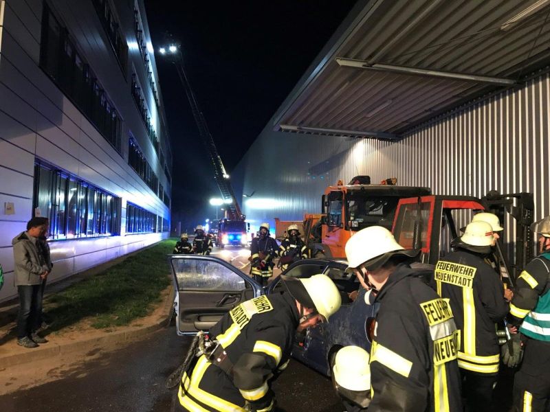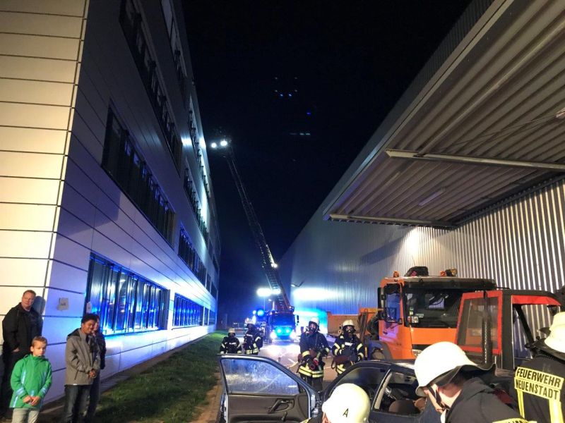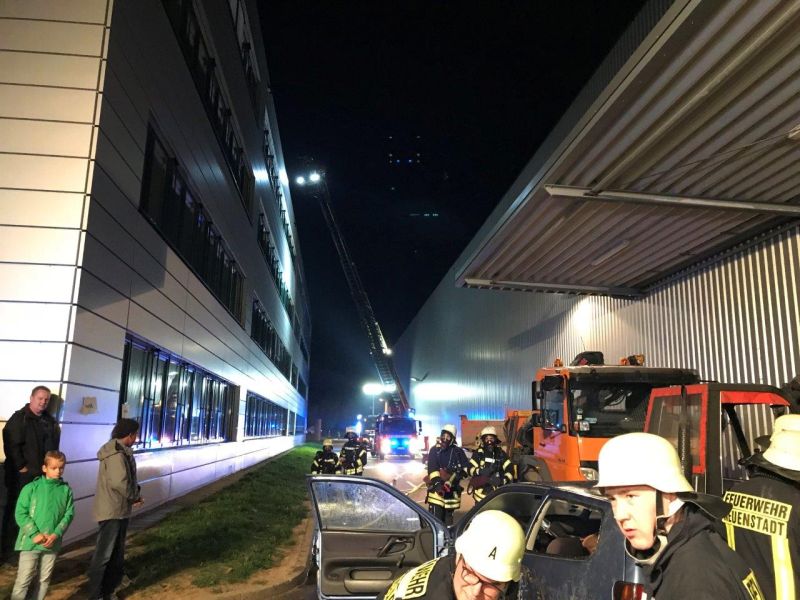 Direkt an der Einfahrt zum Gewerbe- und Industriepark Unteres Kochertal (GIK) befindet sich das Unternehmen Kardex Mlog Logistics GmbH, ein Hersteller von automatischen Hochregallagersystemen. Hier fand am Freitagabend die gemeinsame Übung aller Abteilungen der Feuerwehr Neuenstadt statt. Das Übungsszenario bestand aus einem Verkehrsunfall zwischen einem PKW und einem Gabelstapler, aus dem sich ein Brand in der Maschinenhalle entwickelte.