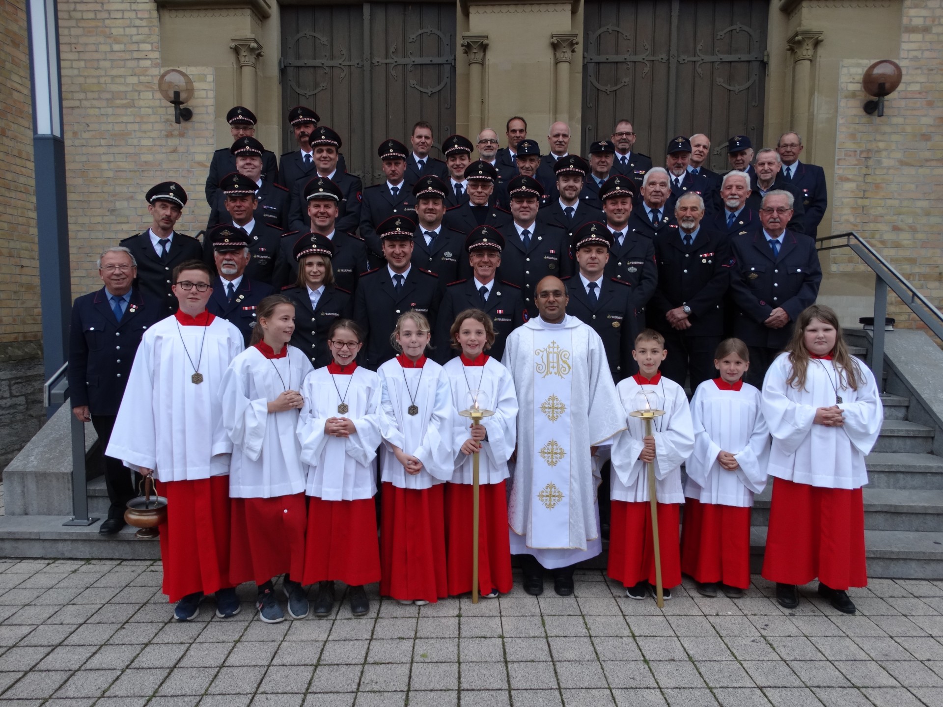 Mehrere Kirchbänke waren gefüllt von den uniformierten Mitgliedern der Feuerwehrabteilung Stein/Kochertürn sowie von einigen Kameraden der Abteilung Neuenstadt, die sich auch aktiv am Gottesdienst mit Lesungen und Fürbitten einbrachten. Pfarrer Reji lobte das freiwillige Engagement der Feuerwehrmitglieder, die sich selbstlos bei Einsätzen in Gefahr bringen um Ihren Mitmenschen Hilfe teilwerden zu lassen. Er sieht in unserem Dienst die Erfüllung des Gebots der Nächstenliebe. Nach dem Gottesdienst und der Segnung der Fahrzeuge der Feuerwehrangehörigen traf man sich auf der Kirchtreppe zusammen mit den zahlreichen Ministranten zum Gruppenbild.
