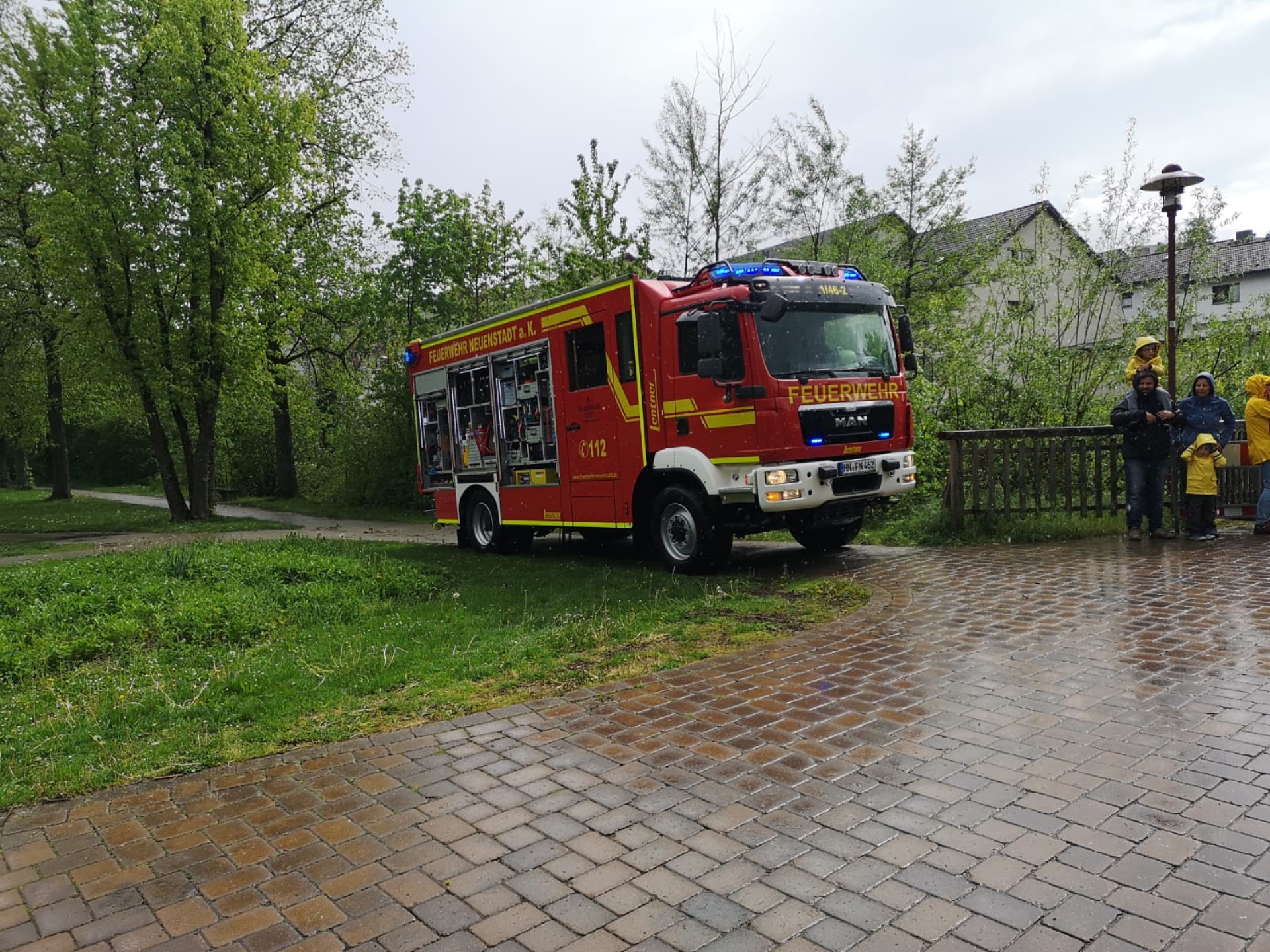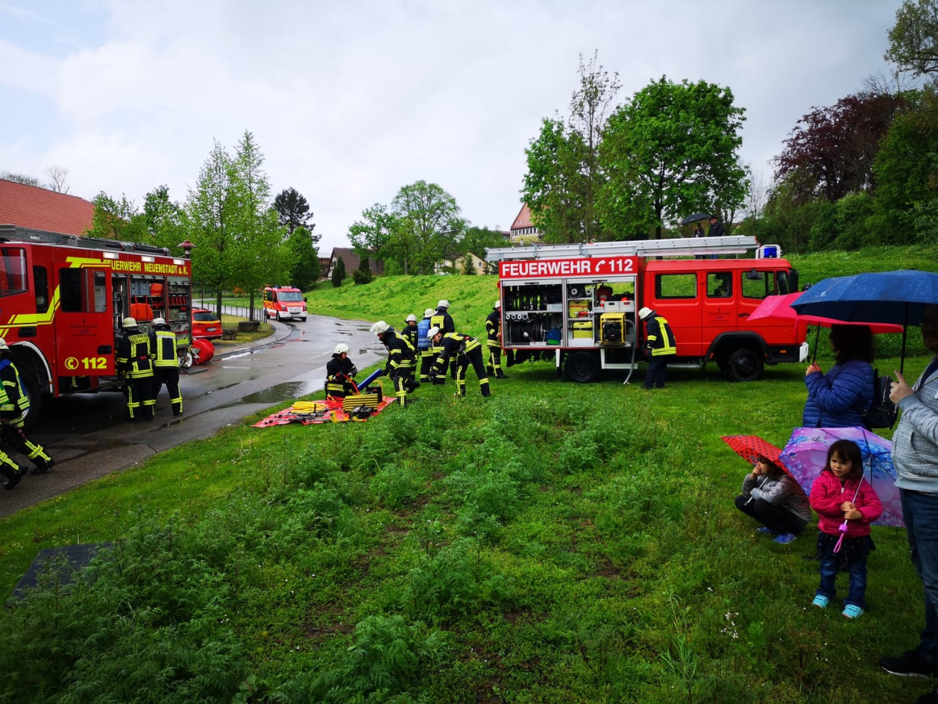 Viel Gerät Dieses Szenario hat sich die Neuenstadter Feuerwehr für die Großübung anlässlich des Feuerwehrfestes ausgedacht. Eine Übung ganz ohne Feuer. „Es geht heute vor allem um technische Hilfeleistung, bei der alle unsere Abteilungen und viel Gerät im Einsatz sind“, sagt der oberste Neuenstadter Feuerwehrmann Hartmut Schaffroth. Mit dem Mikro flitzt er zwischen den beiden Einsatzorten, Brettachufer und Mühlweg hin und her