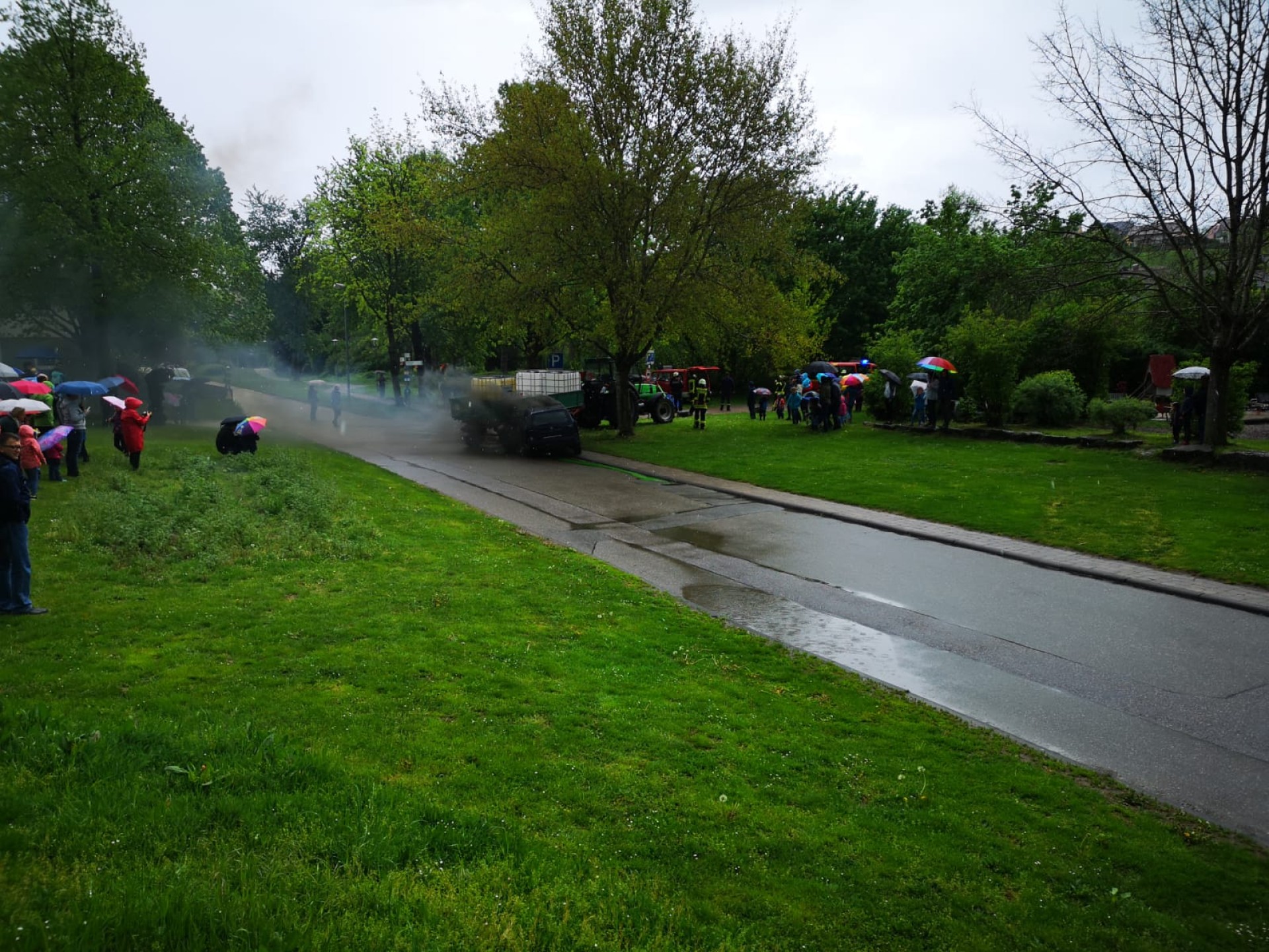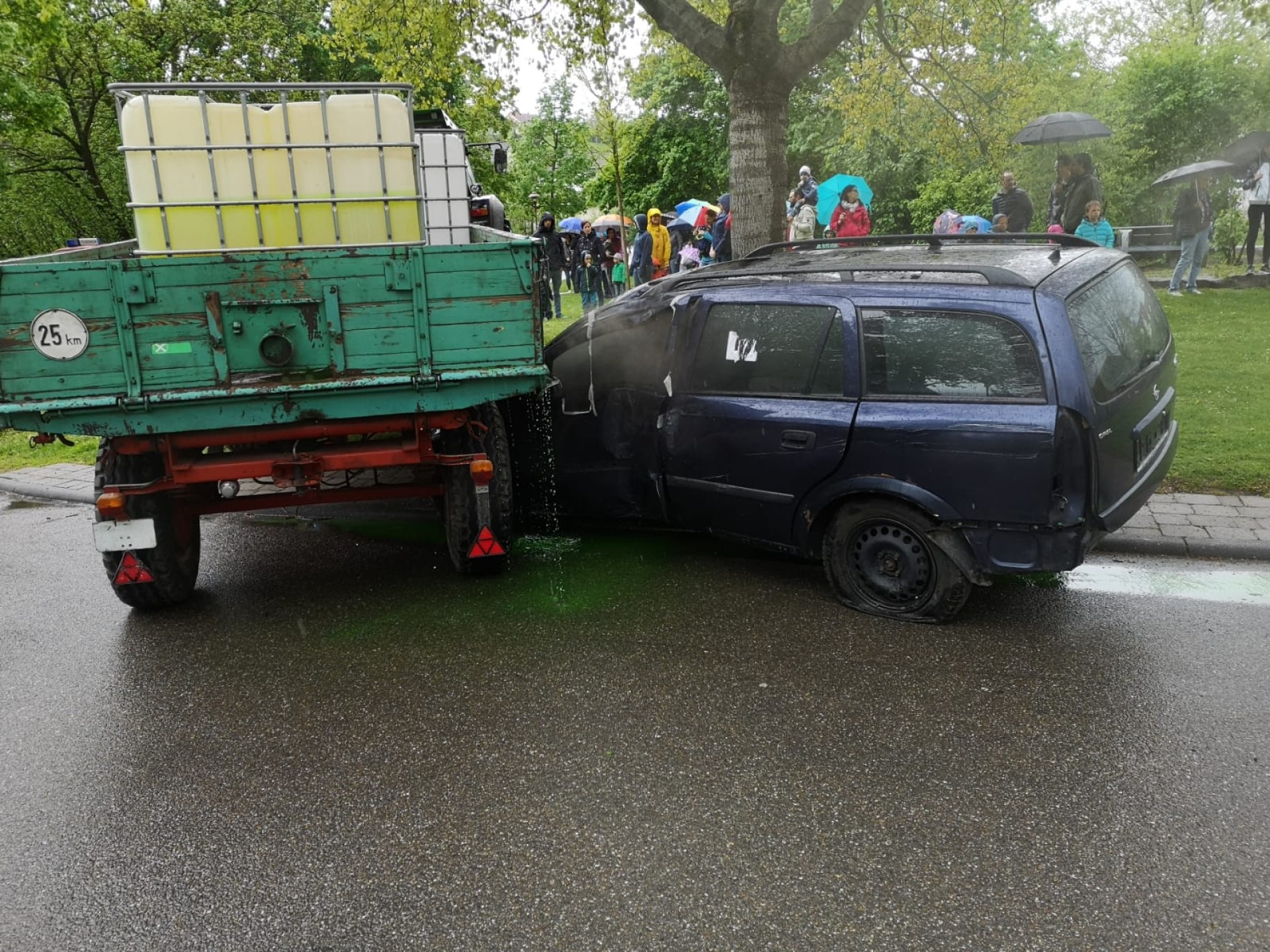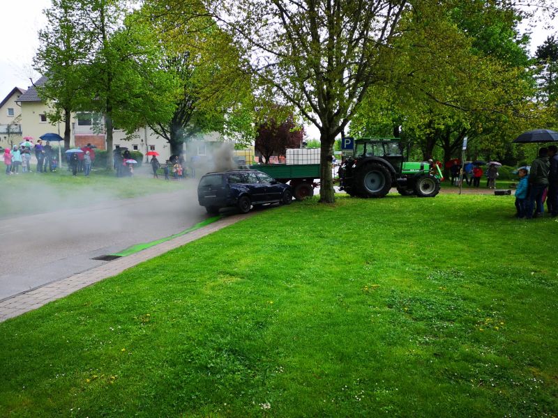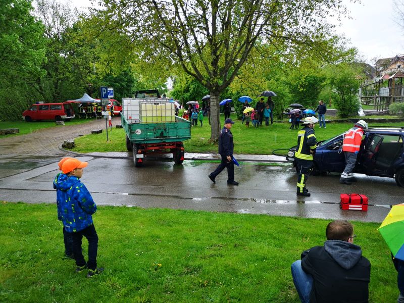 Wie jedes Jahr sind sehr viele kleine Jungs und Mädchen unter den Zuschauern. Mit großenAugen bestaunen sie die herbeirasenden Einsatzfahrzeuge. Der Pkw, der in den Anhänger gekracht ist, raucht gefährlich. Hier übernimmt die Besatzung eines HFL – eines Hilfeleistungslöschgruppenfahrzeugs – die Bekämpfung eines drohenden Brandes, während am Fluss auch hydraulisches Gerät zum Einsatz kommt. Ein Behälter auf dem Traktoranhänger ist leck geschlagen und verliert gefährlich grün aussehende Flüssigkeit.