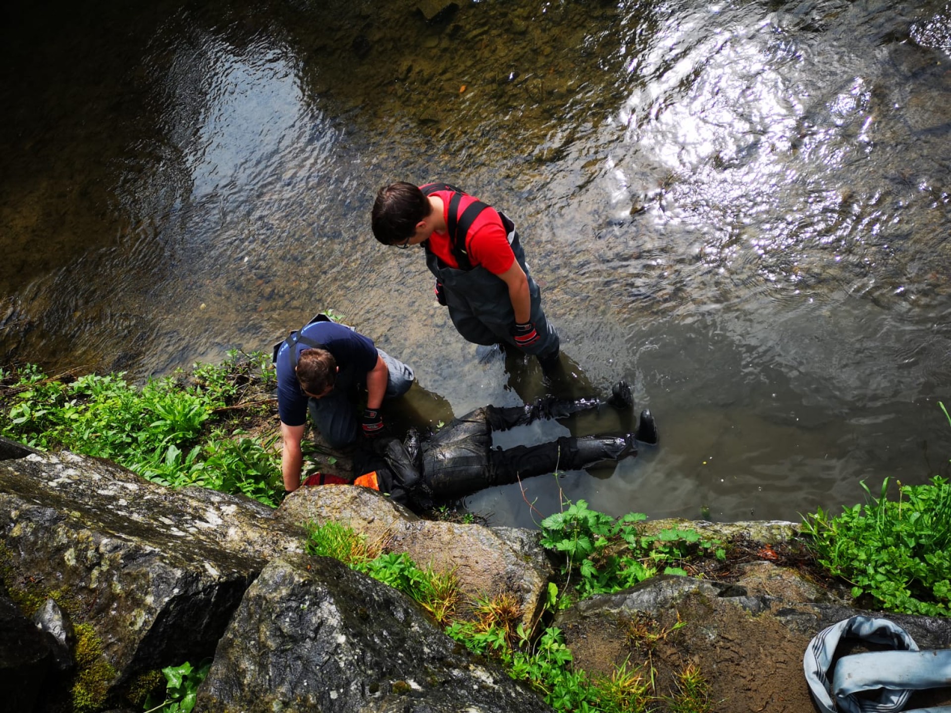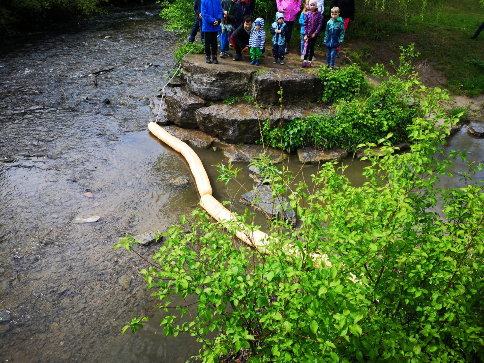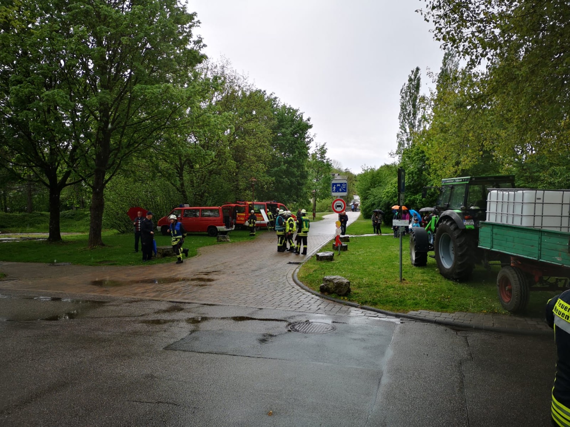 Wie jedes Jahr sind sehr viele kleine Jungs und Mädchen unter den Zuschauern. Mit großenAugen bestaunen sie die herbeirasenden Einsatzfahrzeuge. Der Pkw, der in den Anhänger gekracht ist, raucht gefährlich. Hier übernimmt die Besatzung eines HFL – eines Hilfeleistungslöschgruppenfahrzeugs – die Bekämpfung eines drohenden Brandes, während am Fluss auch hydraulisches Gerät zum Einsatz kommt. Ein Behälter auf dem Traktoranhänger ist leck geschlagen und verliert gefährlich grün aussehende Flüssigkeit.
