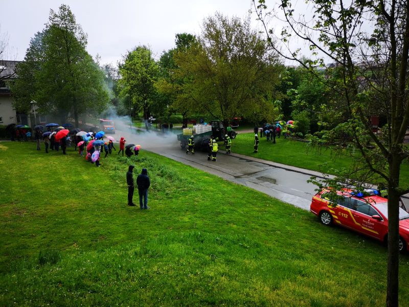 und erklärt den Zuschauern die Situation, mit der es die Feuerwehrleute bei der Übung zutun haben. „Jetzt geht der Alarm gleich los, vielleicht halten Sie den Kindern lieber die Ohren zu“, warnt er.