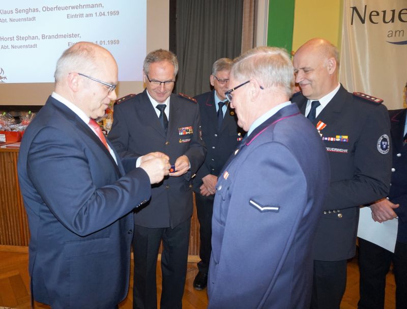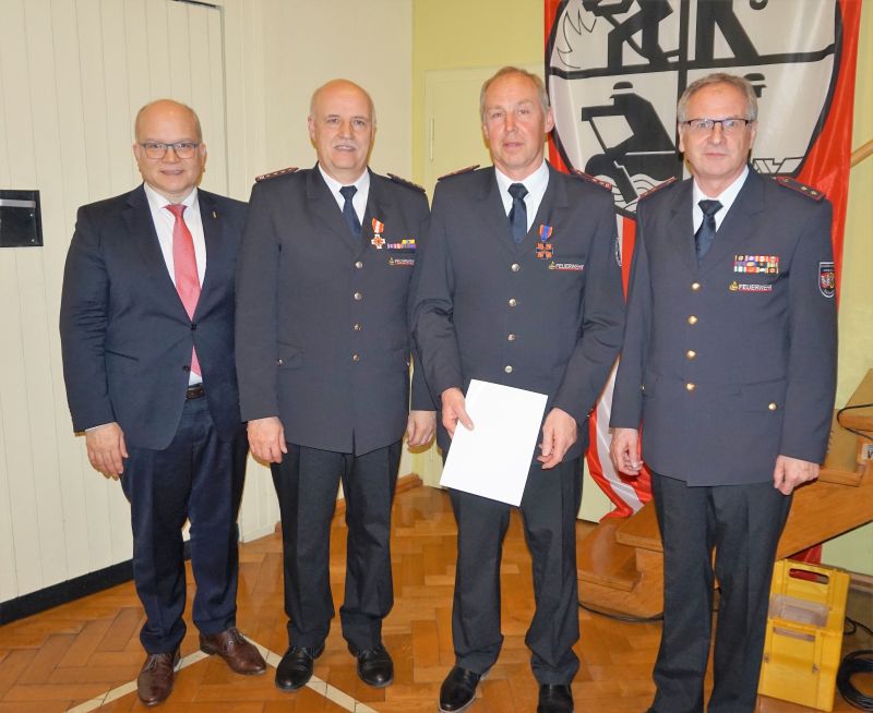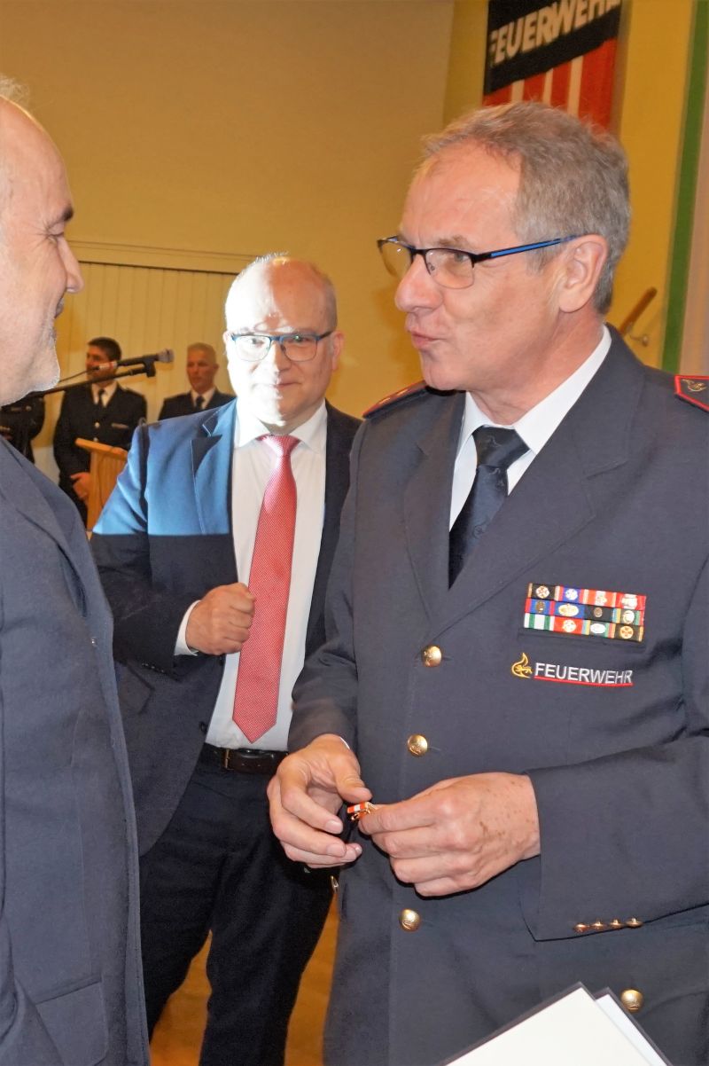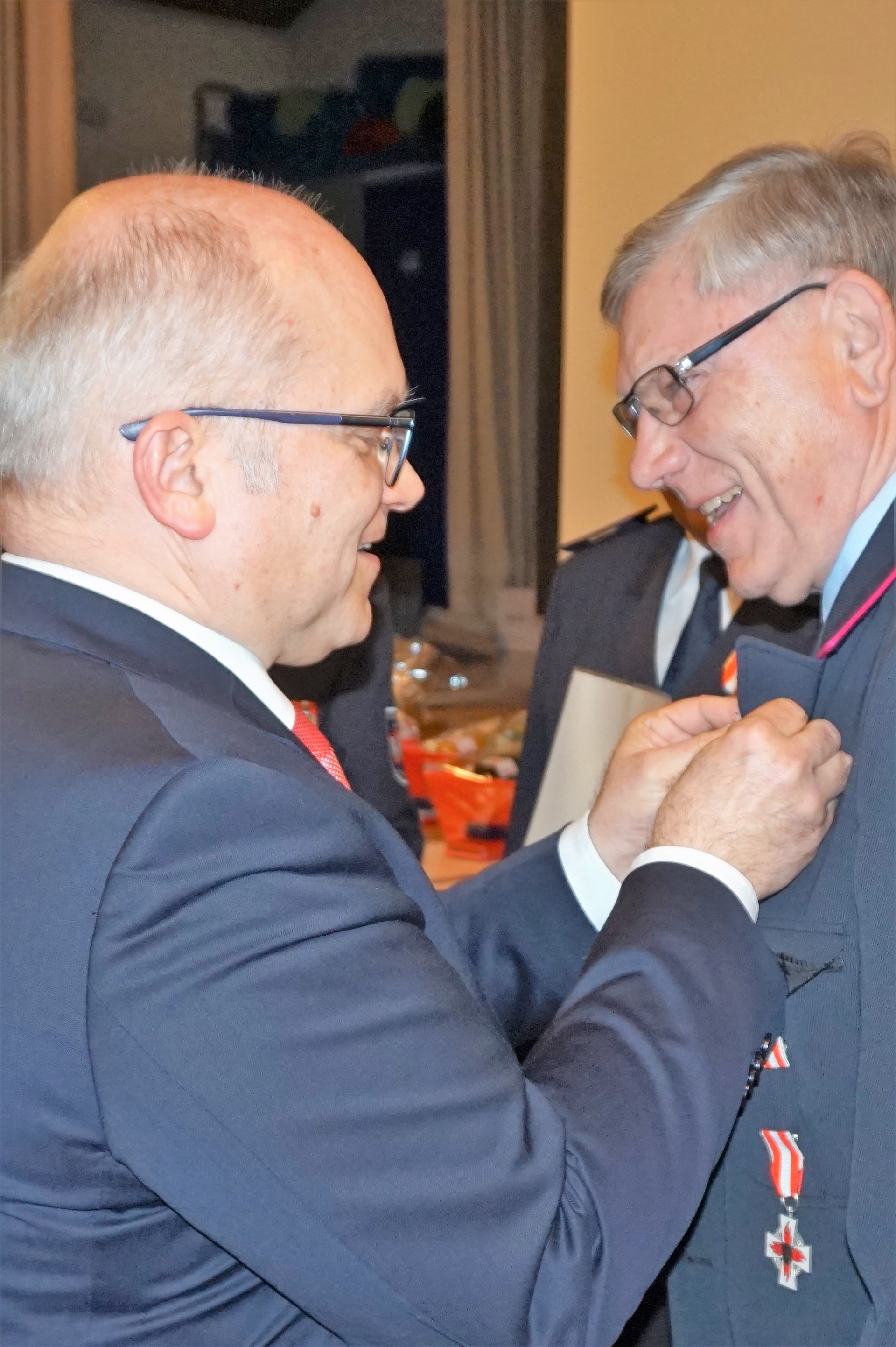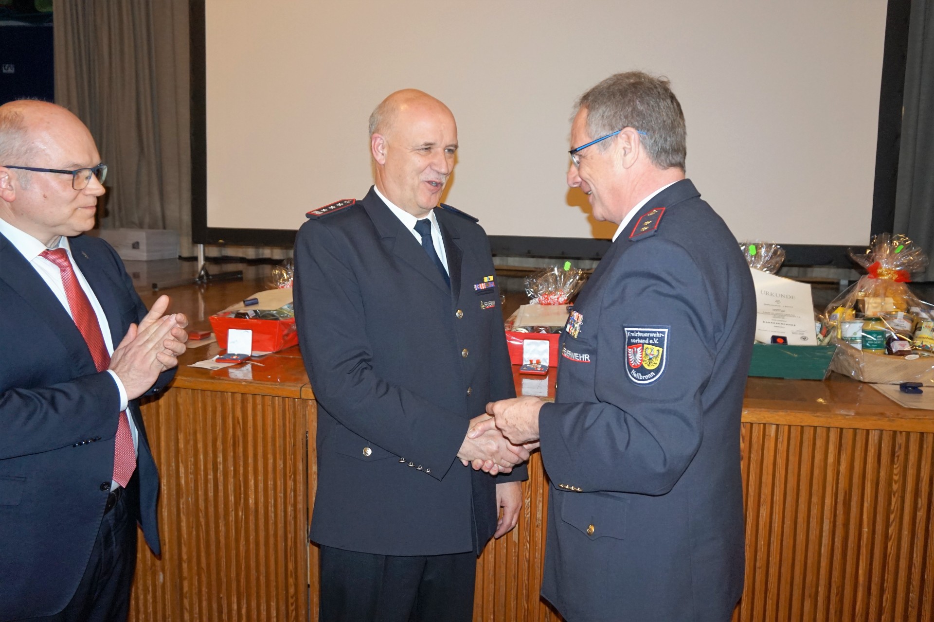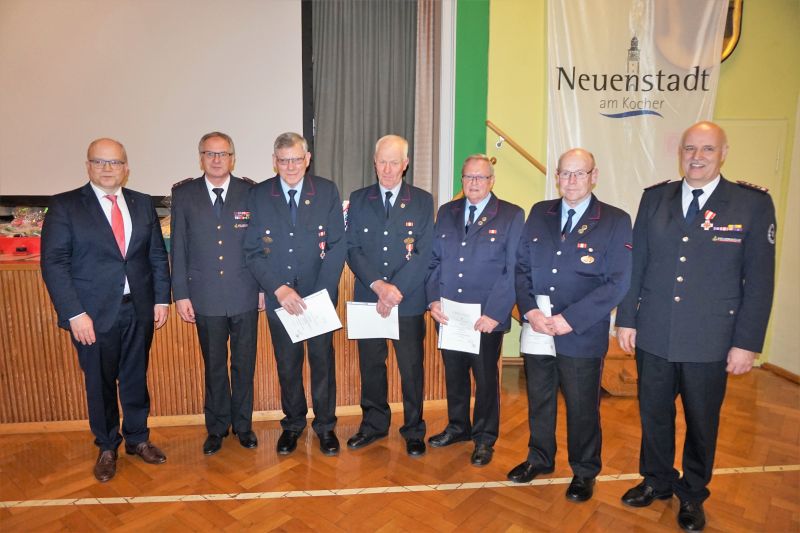In Neuenstadt wird eine sehr gute Arbeit mit einer klaren Vision für die Zukunft gemacht, so der Vorsitzende des Kreisfeuerwehrverbandes Reinhold Gall. Er dankte Kdt. Schaffroth, welcher in den letzten Jahren im Kreisfeuerwehrausschuss mitgewirkt hatte. An die anwesenden Ortschafts- und Gemeinderäte richtete er den Appell, sich mit der Zukunft der Feuerwehr auseinander zu setzen. Zur großen Überraschung des stellvertretenden Kommandanten Roland Grünagel konnte Reinhold Gall ihn mit dem Feuerwehrehrenkreuz des Deutschen Feuerwehrverbandes in Bronze ehren. Grünagel ist seit 1992 in verschiedenen Ämtern in der Feuerwehrführung tätig und war von 2001 bis 2017 Abteilungskommandant von Neuenstadt.
