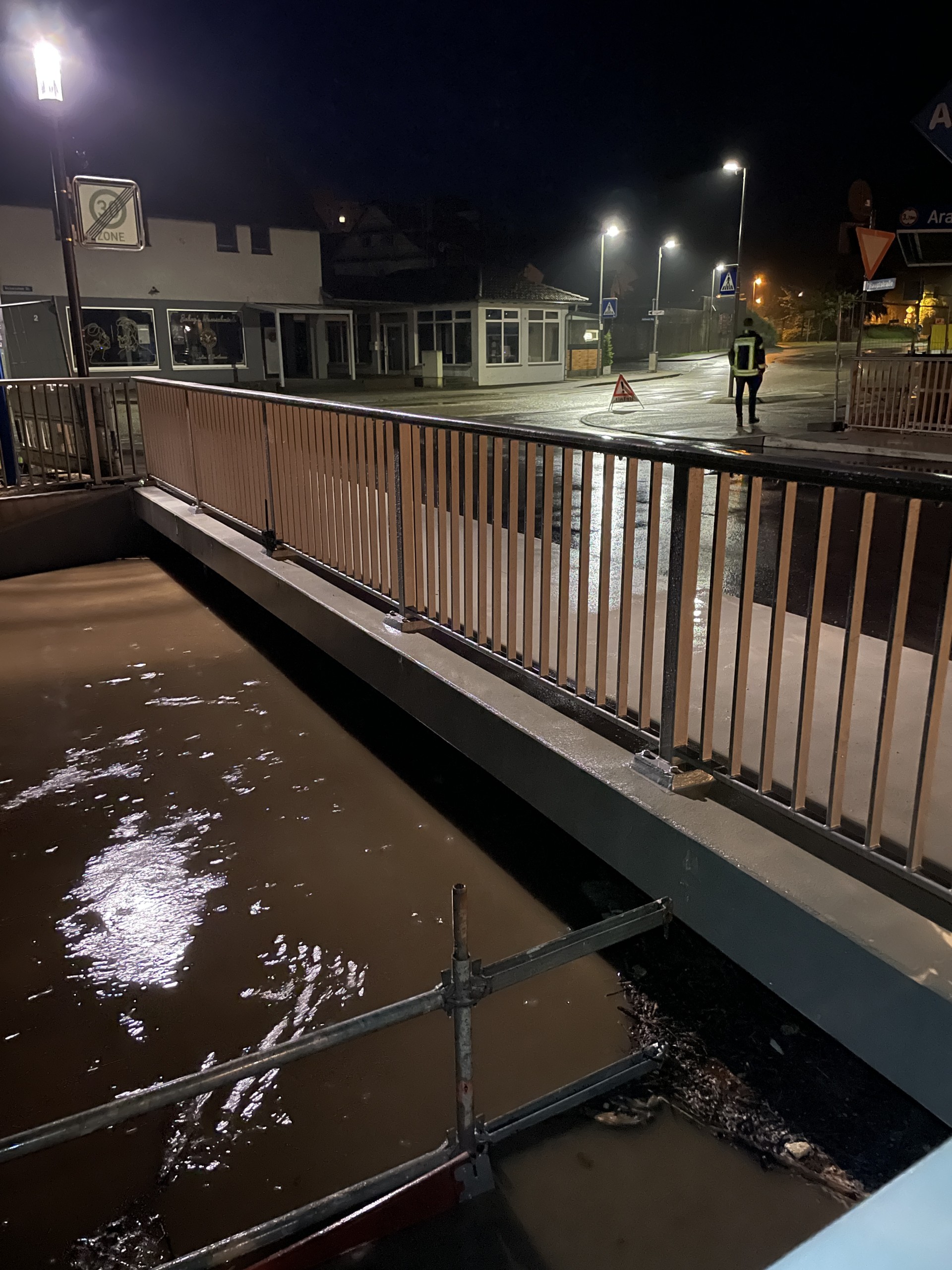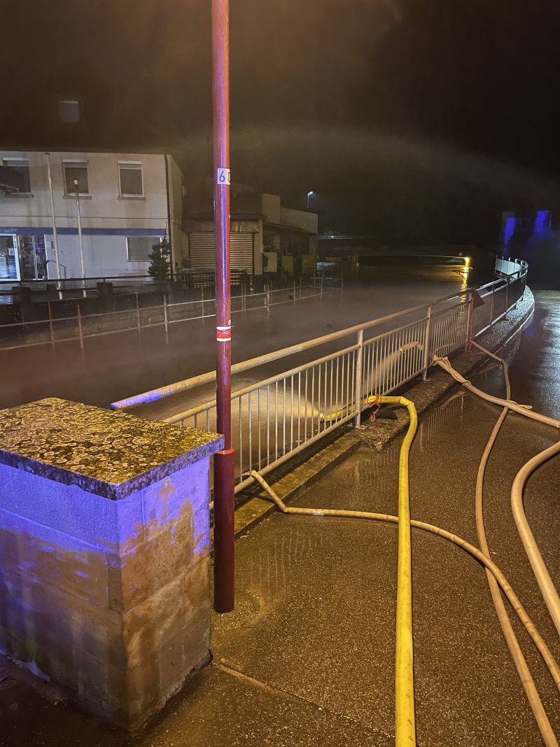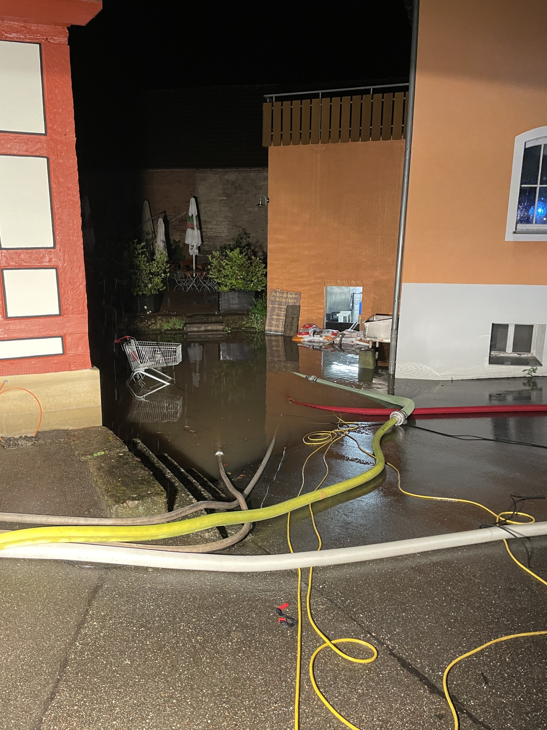 Um 1:30 Uhr wurde die Feuerwehr erneut alarmiert. In der Manggasse stand das Wasser bereits einen halben Meter hoch. Mehrere Pumpen wurden sofort in Betrieb genommen, um das Wasser abzupumpen. Die Brettach stand zu diesem Zeitpunkt knapp unter der Brücke.