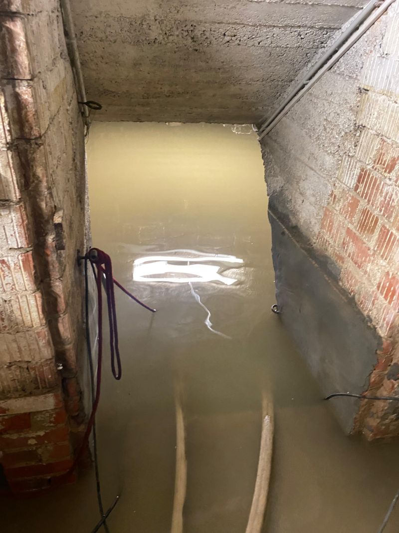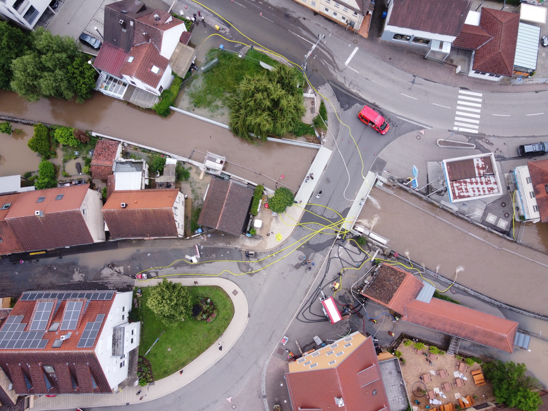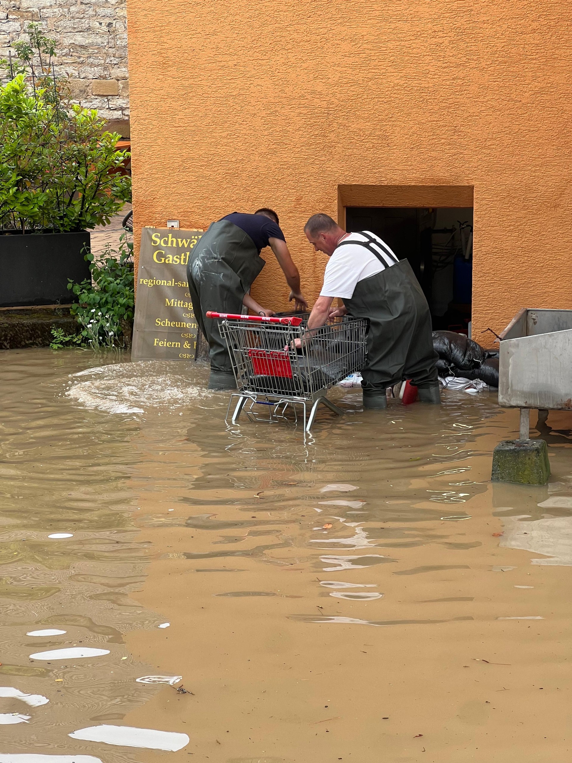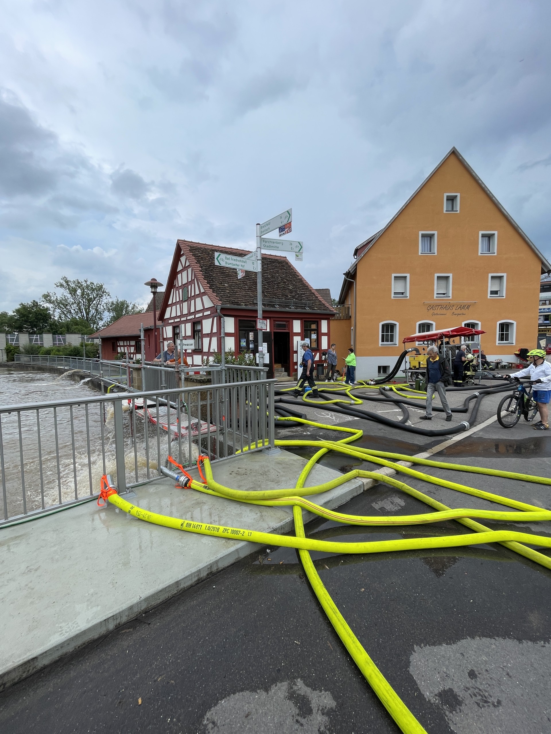 Um 1:30 Uhr wurde die Feuerwehr erneut alarmiert. In der Manggasse stand das Wasser bereits einen halben Meter hoch. Mehrere Pumpen wurden sofort in Betrieb genommen, um das Wasser abzupumpen. Die Brettach stand zu diesem Zeitpunkt knapp unter der Brücke.