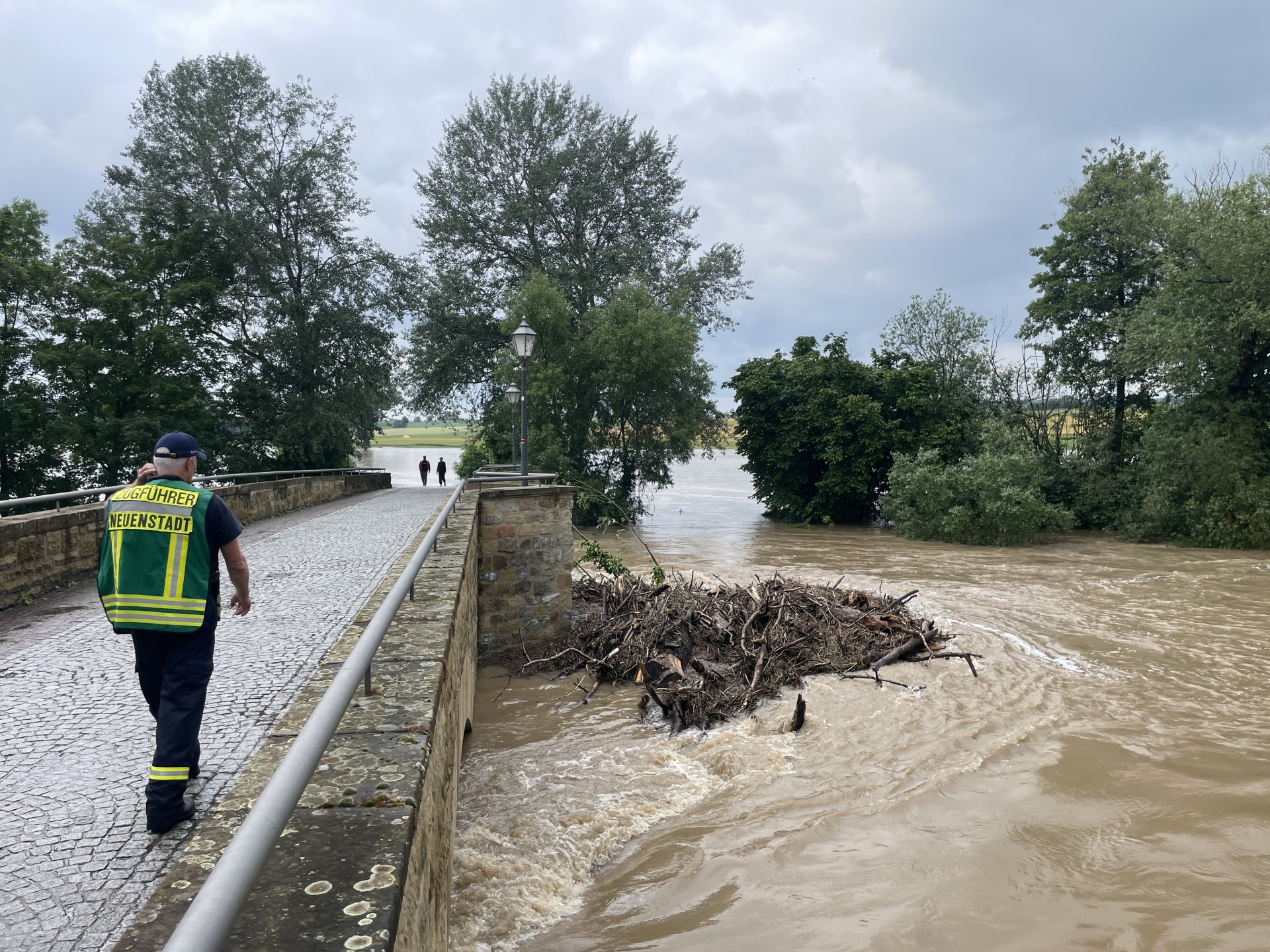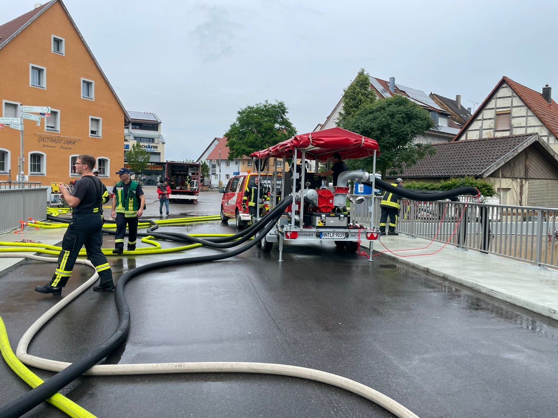 Inzwischen drückte das Wasser aus sämtlichen Abwasserschächten heraus. In Kochertürn stieg der Kocher ebenfalls stetig. Um 5:30 Uhr wurde die Abteilung Stein alarmiert, gefolgt von der Alarmierung der Abteilung Cleversulzbach kurz nach 6:00 Uhr zur Unterstützung in Neuenstadt. Zusätzlich zu den Sandsäcken vom AB-Sandsack kamen 1000 Säcke vom THW Widdern. Um 10:30 Uhr traf die Großpumpe der Feuerwehr Wüstenrot/Löwenstein ein, die vom Landkreis für den Katastrophenschutz beschafft worden war.