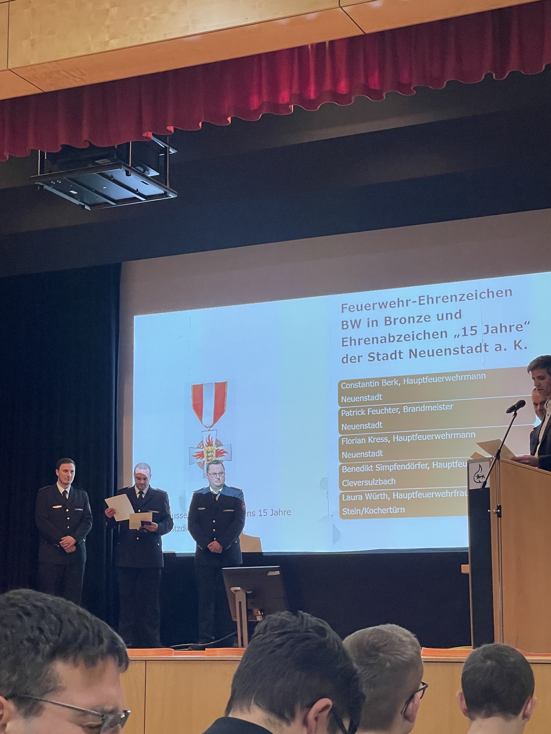 Zusätzlich wurden an diesem Abend Florian Kress, Constantin Berk, Benedikt Simpfendörfer, Patrick Feuchter und Laura Würth mit dem Feuerwehr-Ehrenzeichen des Landes Baden-Württemberg in Bronze sowie dem Ehrenabzeichen “15 Jahre” der Stadt Neuenstadt a. K. ausgezeichnet. Timo Enchelmaier und Simon Kumm sind bereits seit 25 Jahren aktive Mitglieder der Feuerwehr, während Detlev Connert und Alfred Wirth seit über 40 Jahren unermüdlich im Einsatzdienst stehen. Mit einer Mitgliedschaft von 50 bzw. 60 Jahren wurden Willi Schmelcher und Wolfgang Spindler für ihre langjährige Treue zur Feuerwehr geehrt. Ein besonderer Moment war die Verleihung des höchsten Ehrenabzeichens an Horst Stephan für “65 Dienstjahre”.