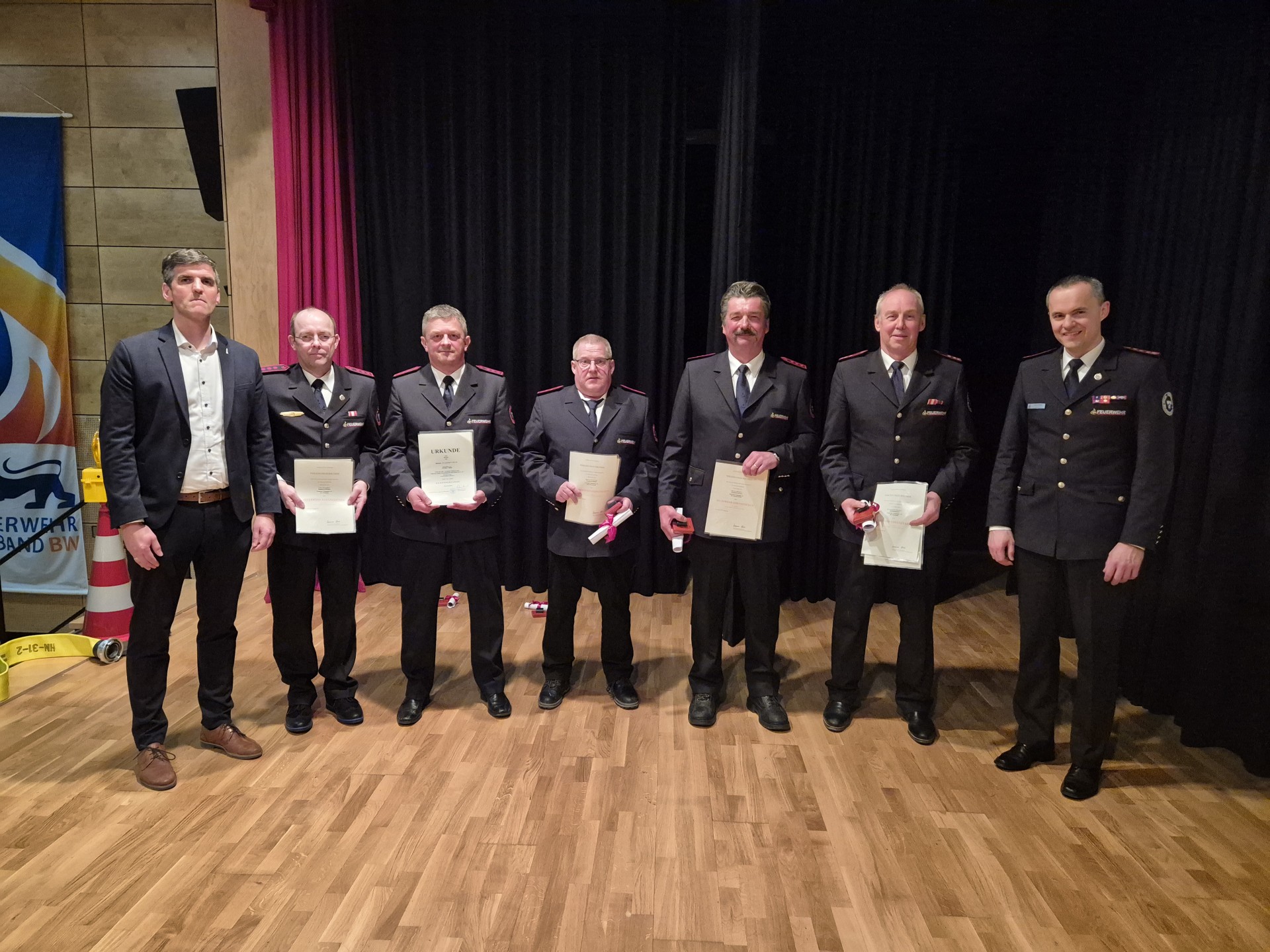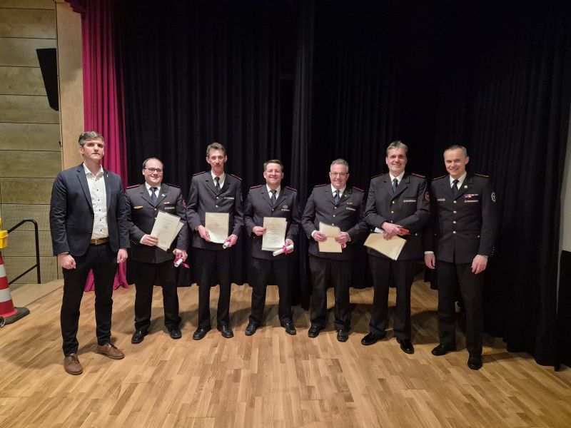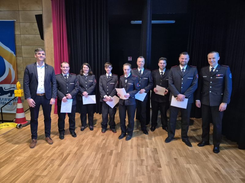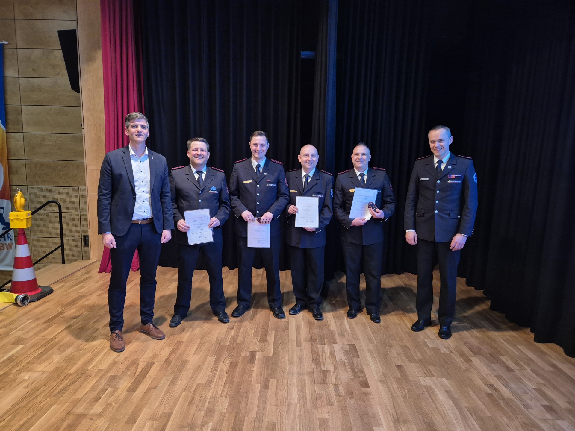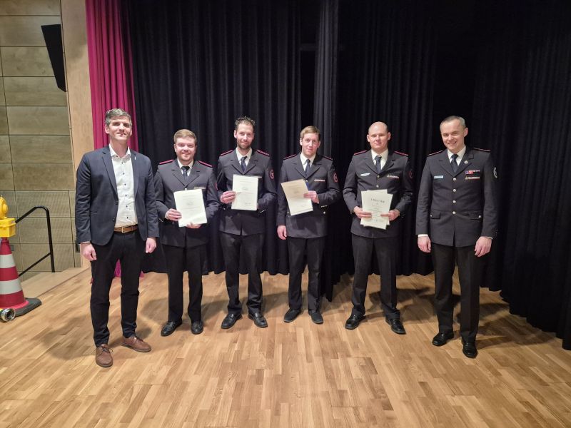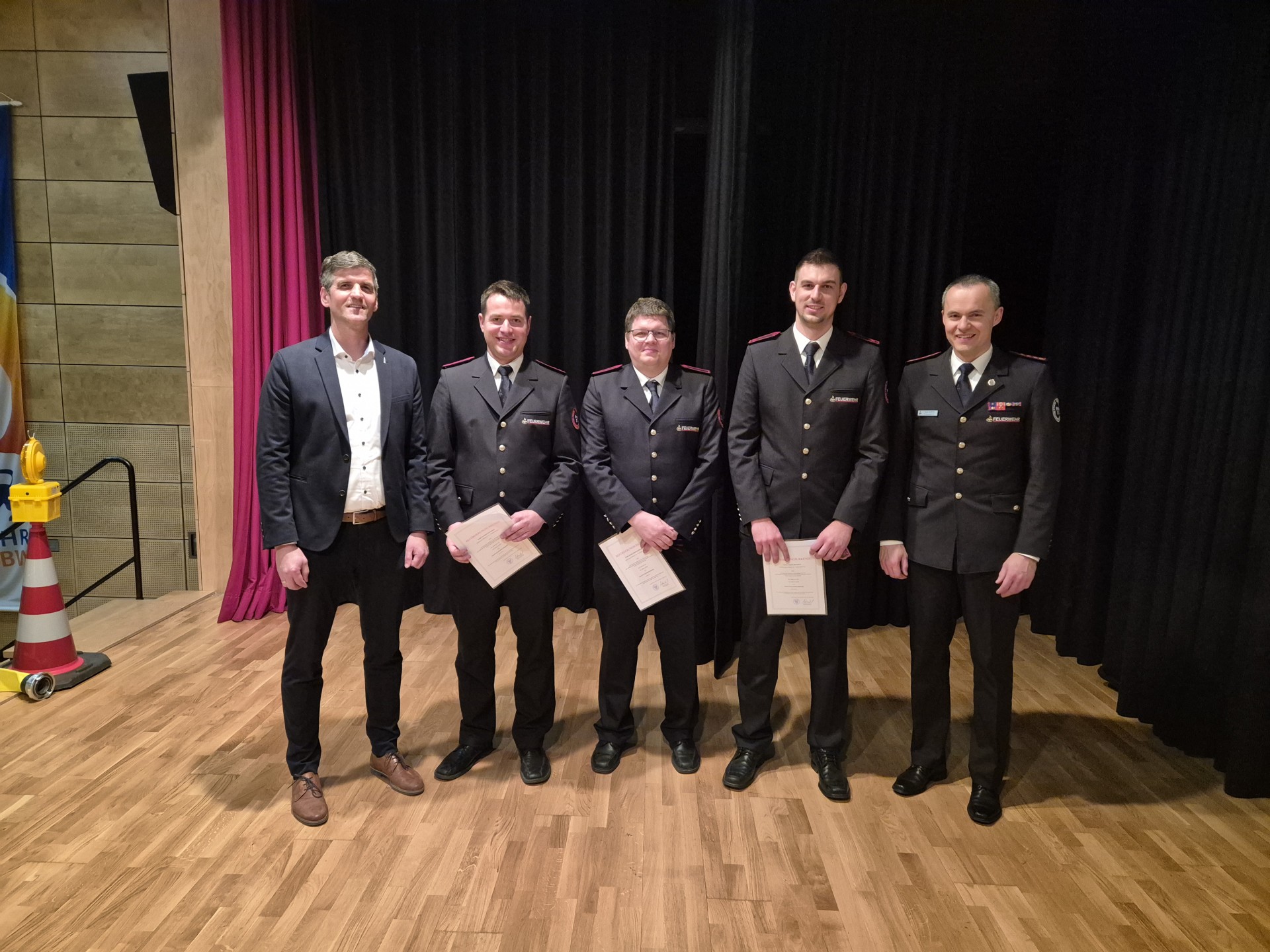Zu Löschmeistern wurden Marvin Anft und Benedikt Simpfendörfer ernannt, nachdem sie erfolgreich den Gruppenführerlehrgang absolviert hatten. Karsten Diesch erhielt die Beförderung zum Hauptlöschmeister für seine fünfjährige Tätigkeit als Oberlöschmeister. In den Rang des Brandmeisters wurden Darius Morawietz und Daniel Ternes erhoben, nachdem sie den Zugführerlehrgang erfolgreich abgeschlossen hatten.