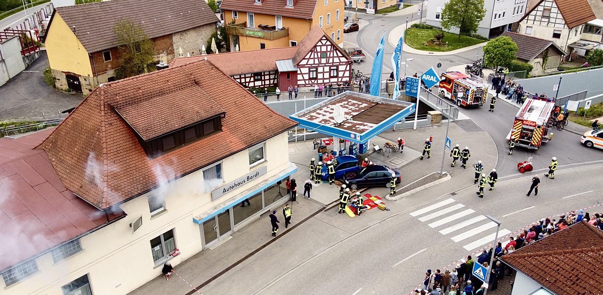 Am Samstag begann das Fest mit einer groß angelegten Schauübung an der Aral-Tankstelle Bordt. Gegen 15 Uhr wurde ein Verkehrsunfall mit mehreren eingeklemmten Personen dargestellt: Ein Fahrzeug verlor beim Abbiegen die Kontrolle und schob ein tankendes Auto gegen eine Zapfsäule. Dabei trat Kraftstoff aus. Kurz darauf kam es zu einem simulierten Wohnungsbrand im Obergeschoss der Tankstelle, bei dem sich noch ein bewegungseingeschränktes Kleinkind befand. Die Abteilungen Neuenstadt und Cleversulzbach waren als erste vor Ort und begannen mit der technischen Rettung und Brandbekämpfung. Im weiteren Verlauf wurde auch die Abteilung Stein/Kochertürn eingebunden. Unterstützt wurde die Übung durch die Rot-Kreuz-Verbände aus Neuenstadt und Möckmühl, die die medizinische Versorgung der Verletztendarsteller übernahmen. Im Anschluss an die Übung fand eine kurze Ansprache an die Mannschaft statt, in der die Leistung und Zusammenarbeit aller Beteiligten gewürdigt wurde.
